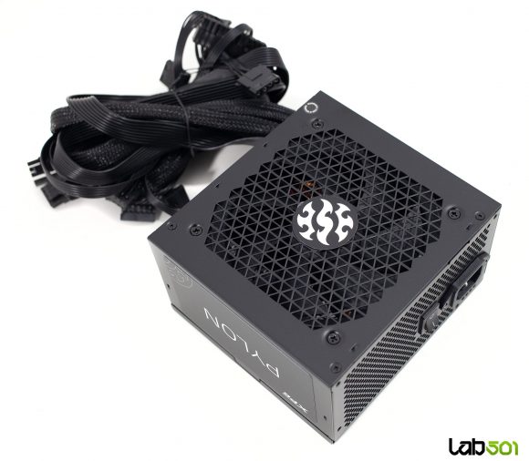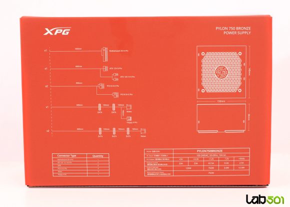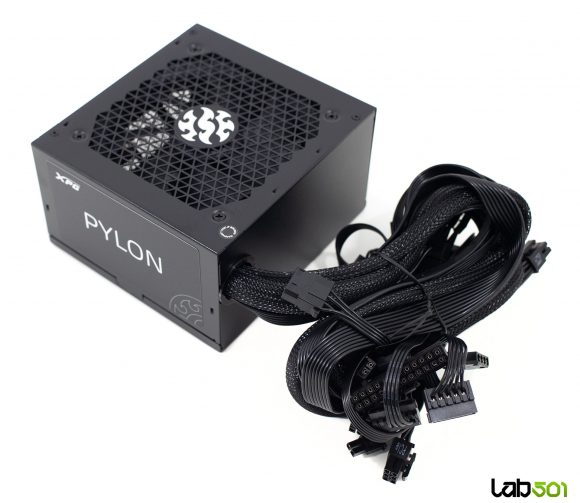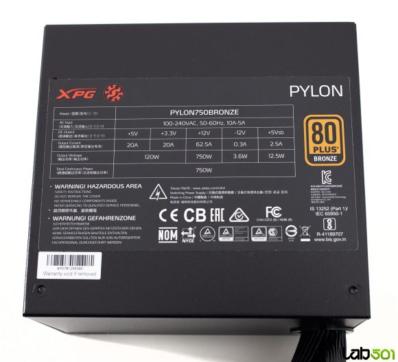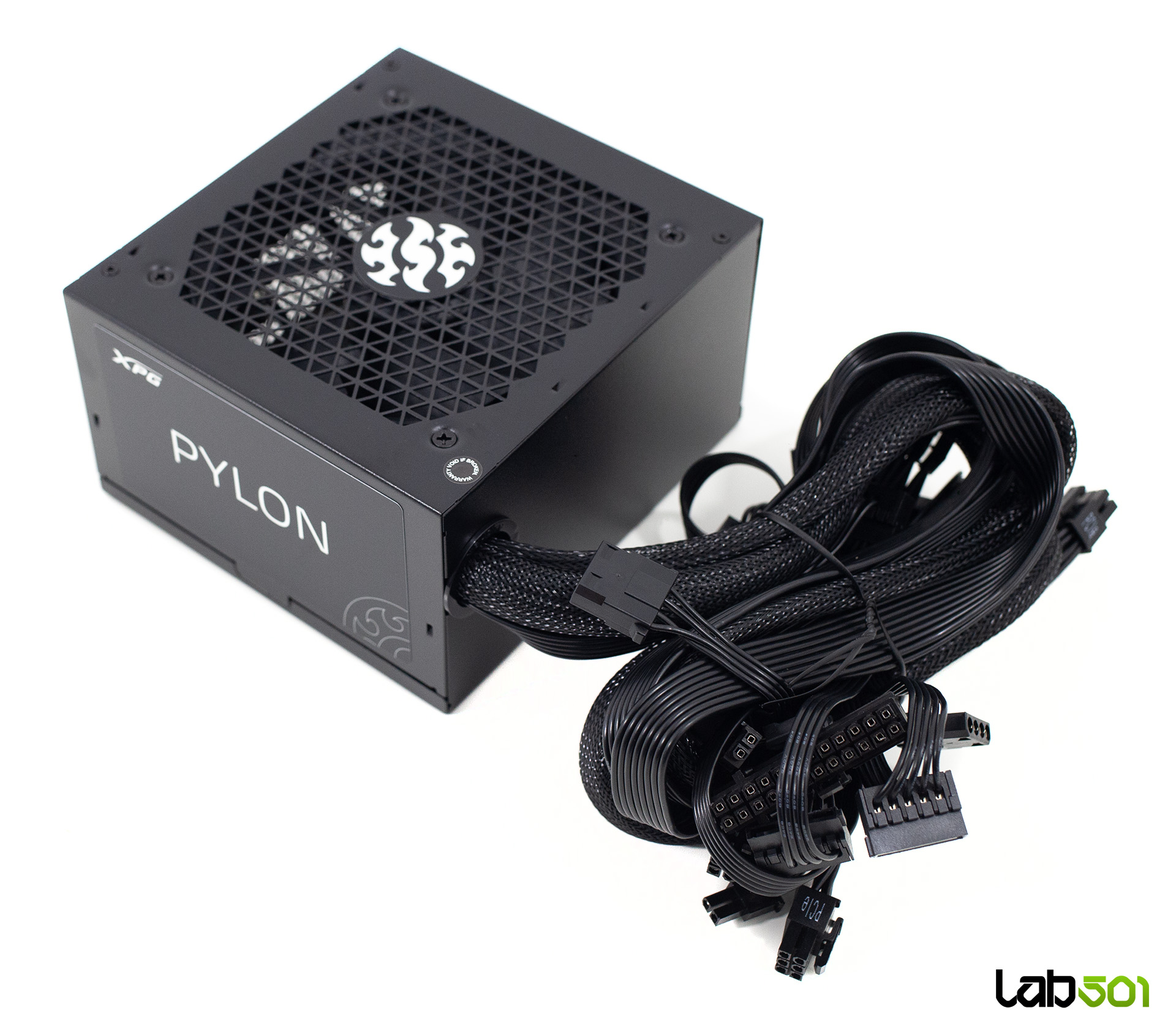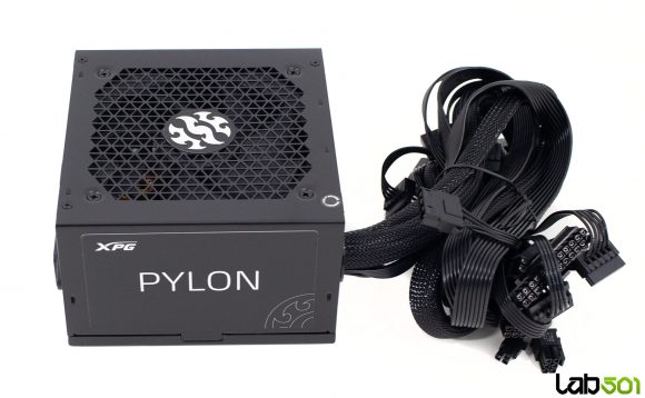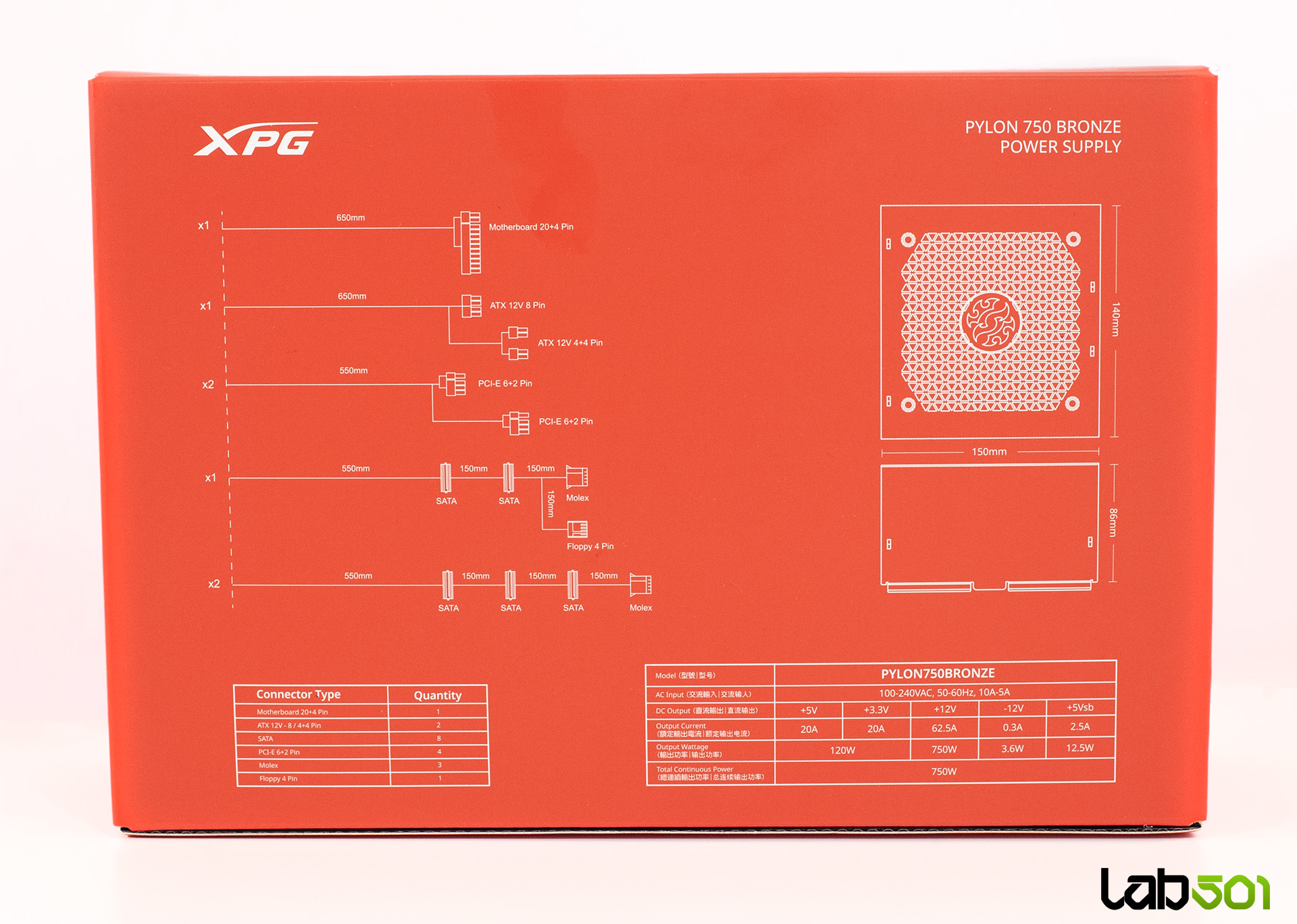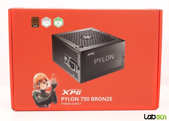 Din punct de vedere al constructiei, XPG Pylon 750 Bronze are format ATX standard, cu o lungime de 14 cm, fiind usor de integrat si in carcase mai compacte. Carcasa are finisaj negru mat, cu perforatii tip fagure pe panoul din spate (pentru evacuarea aerului cald), precum si pe partea inferioara pentru admisia de aer a ventilatorului de 120 mm. Lateralele poarta logo-ul XPG si denumirea modelului “Pylon”, imprimate simplu, iar pe partea superioara este aplicata eticheta cu specificatiile electrice. Pe panoul din spate al sursei se afla intrerupatorul On/Off si mufa de alimentare IEC standard.