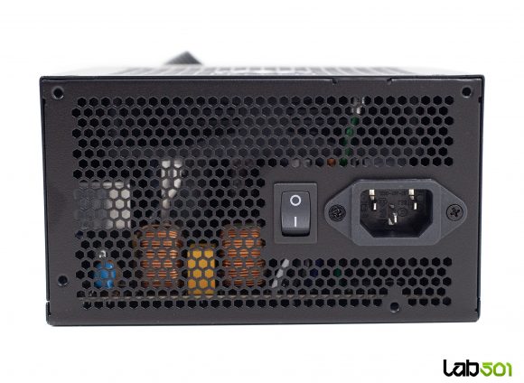 Pe una dintre lateralele sursei se afla eticheta cu specificatiile electrice – linia de +12V are o configuratie single-rail, putand furniza toata puterea sursei, mai exact 62.5A (750W). Rail-urile de +3.3V si +5V sunt derivate DC-to-DC din +12V, fiind cotate la 20A fiecare, impreuna putand livra un maxim de 120W. Aceasta capacitate este mai mult decat suficienta, avand in vedere ca in sistemele moderne principalii consumatori se alimenteaza de la +12V.