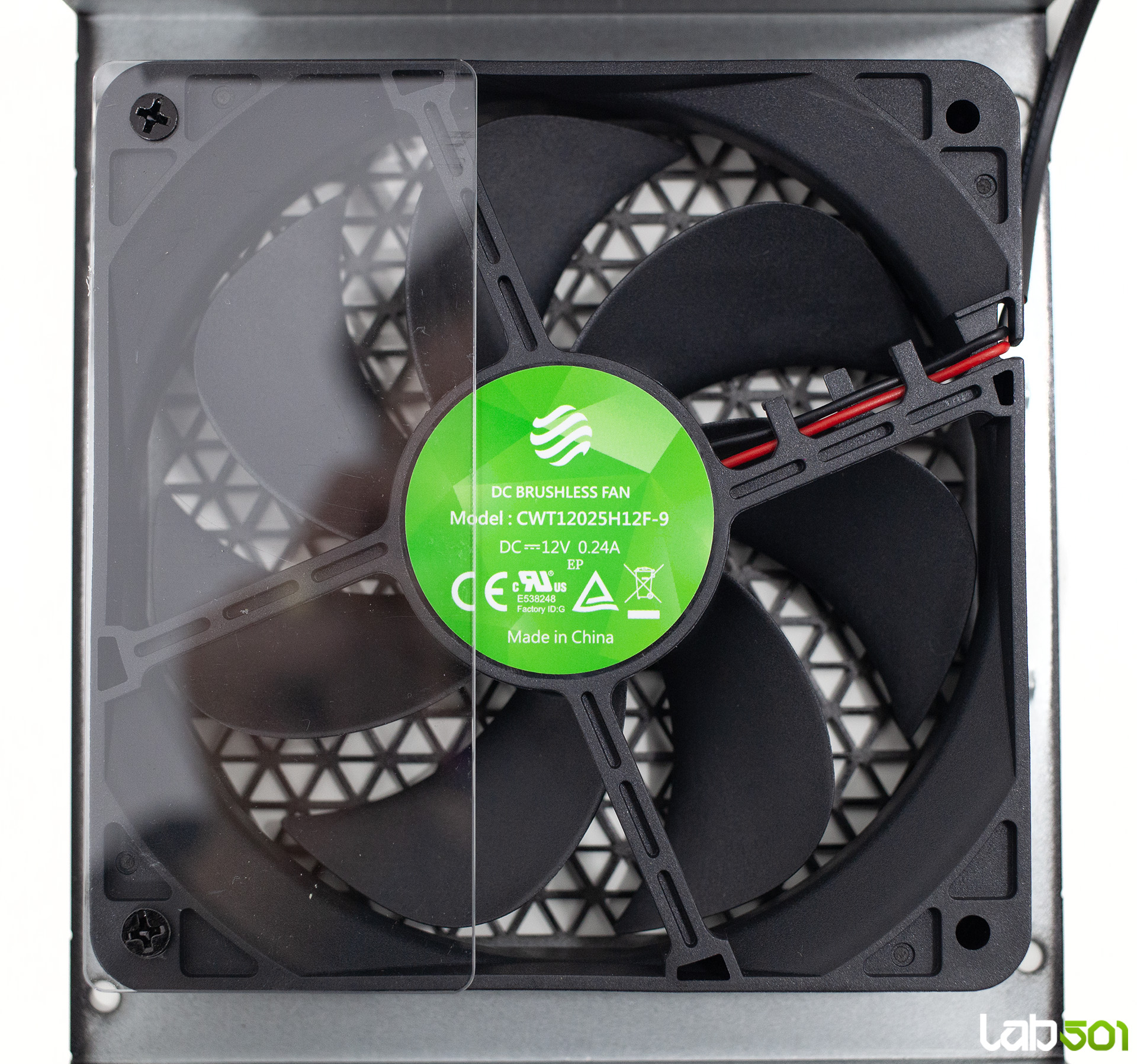 Ventilatorul de 120 mm poarta codul CWT12025H12F-9, este produs de CWT si foloseste lagar pe lichid (FDB), avand o turatie maxima de 2325 RPM. In lipsa unui mod semi-pasiv, ruleaza continuu: sub 800 RPM pana la 60% incarcare, urca spre 1000 RPM la 80% incarcare si accelereaza mai pronuntat pana la ~1560 RPM atunci cand sursa este solicitata la capacitate maxima (100%).