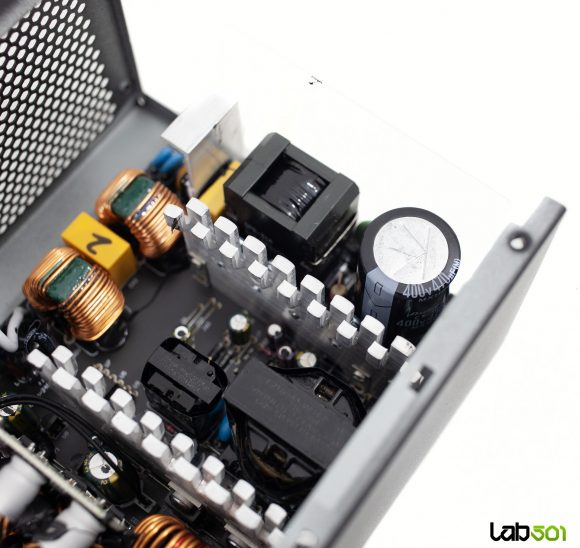 Condensatorul principal din primar este un Rubycon din seria MXH, 470 µF / 400 V, cotat la 105°C – suficient pentru a asigura un hold-up time conform cerintelor ATX 3.1. In secundar regasim condensatori electrolitici Teapo, alaturi de cativa polimerici CapXon pe placa DC-DC.