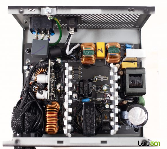 Privind in interior, observam ca filtrarea EMI este implementata corect, ca la carte: chiar pe conectorul IEC regasim doi condensatori de tip Y si unul de tip X (fara circuit de descarcare), iar pe PCB filtrarea continua cu o siguranta fuzibila, inca doi condensatori Y, al doilea condensator X, doua bobine de mod comun (CM) si un varistor pentru protectie la supratensiuni (surge). Desi schema este minimalista, isi face treaba in reducerea emisiilor EMI. Limitarea curentului de pornire (inrush) este realizata printr-un termistor NTC; lipsa unui releu de bypass este o masura de control al costurilor.