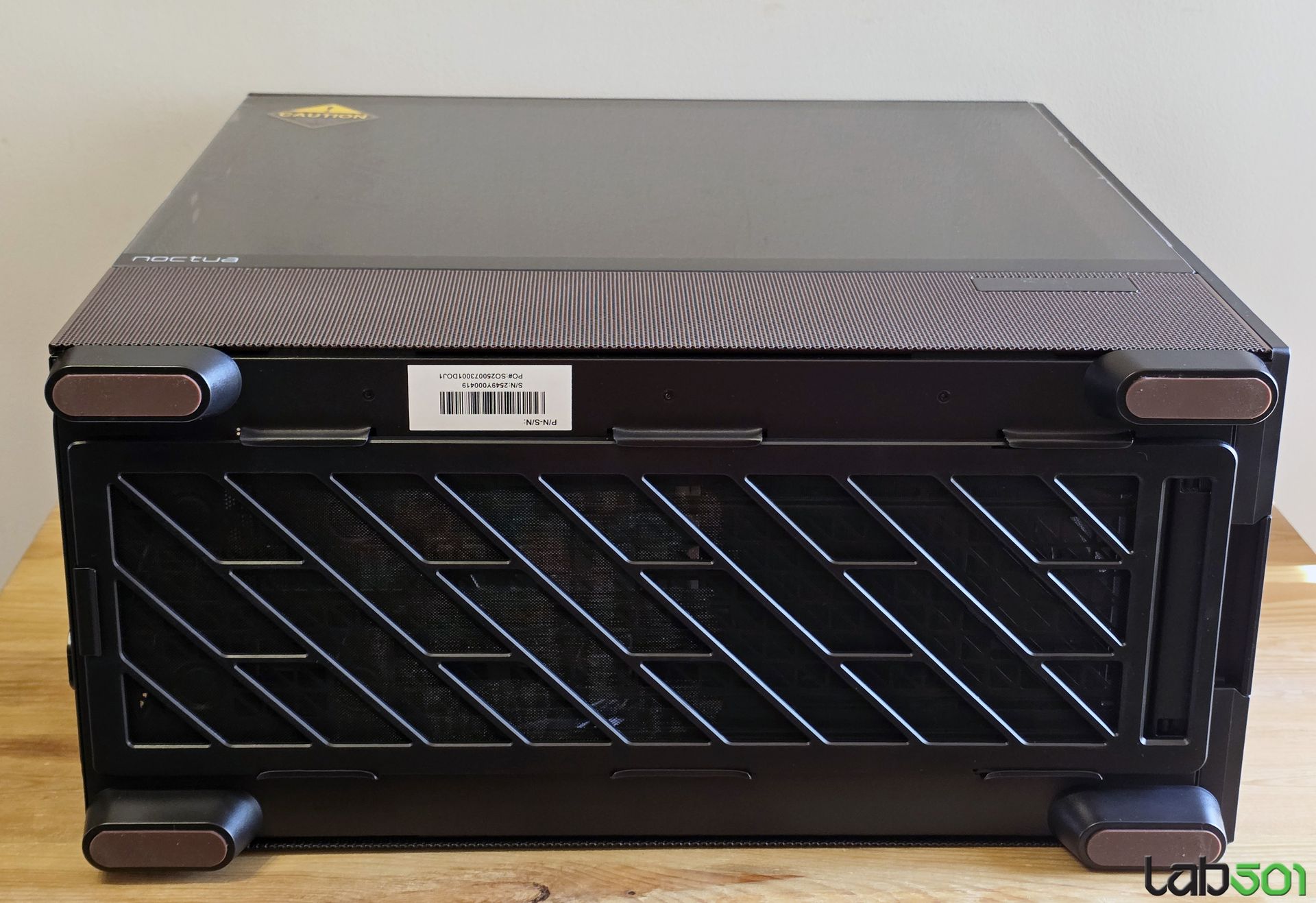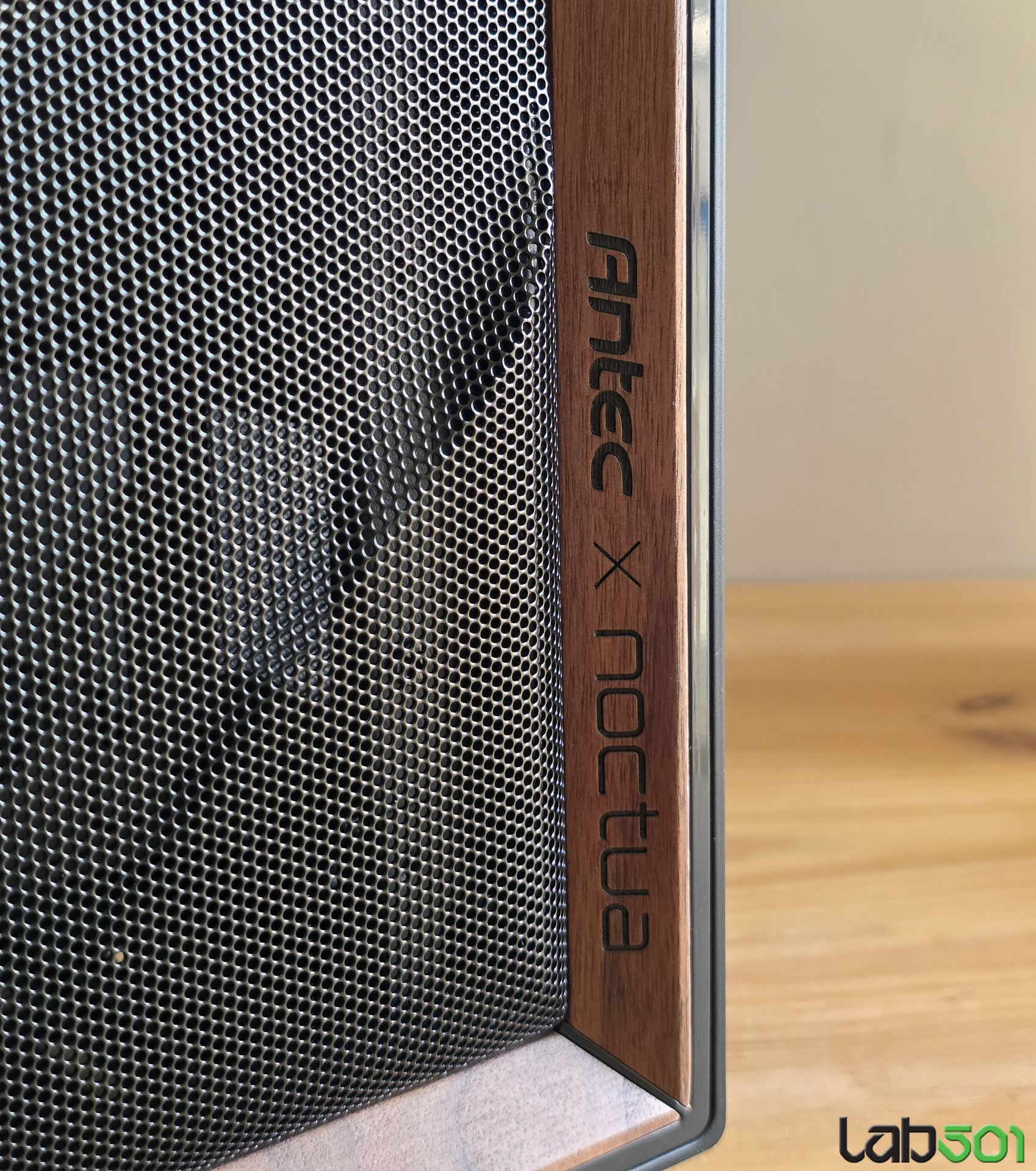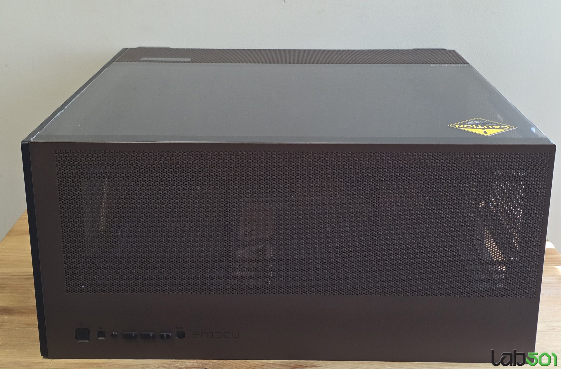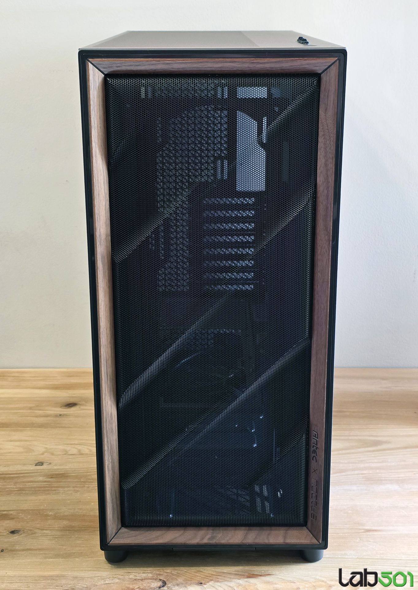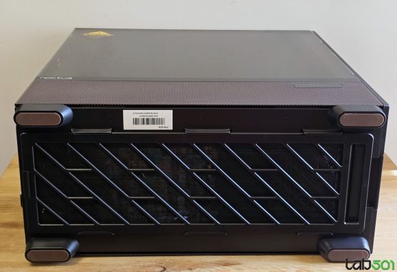 Pe langa ventilatoarele si accesoriile incluse in pachet, amprenta Noctua este data de insertia de nuc care flancheaza elegant suprafata uriasa de mesh de pe latura frontala, respectiv de culoarea specifica producatorului austriac, in care este vopsita latura inferioara a lateralei stanga, respectiv latura superioara a carcasei. De altfel, nici un detaliu nu a fost lasat la voia intamplarii, astfel incat pana si insertiile de cauciuc de pe picioarele care sprijina carcasa pe birou au culoarea specifica Noctua.