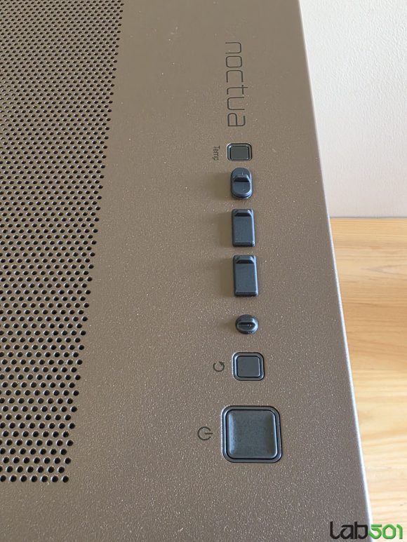 Conectica este montata pe latura superioara a carcasei, Antec Flux Pro Noctua Edition fiind prima carcasa testata de mine unde fiecare conector este protejat cu ajutorul unei insertii de cauciuc. Aici gasim 2 conectori USB 5Gbps, 1 conector USB-C 10Gbps, butonul Power, butonul Reset, conectorul audio in/out si un buton cu ajutorul caruia putem ajusta turatia ventilatoarelor.