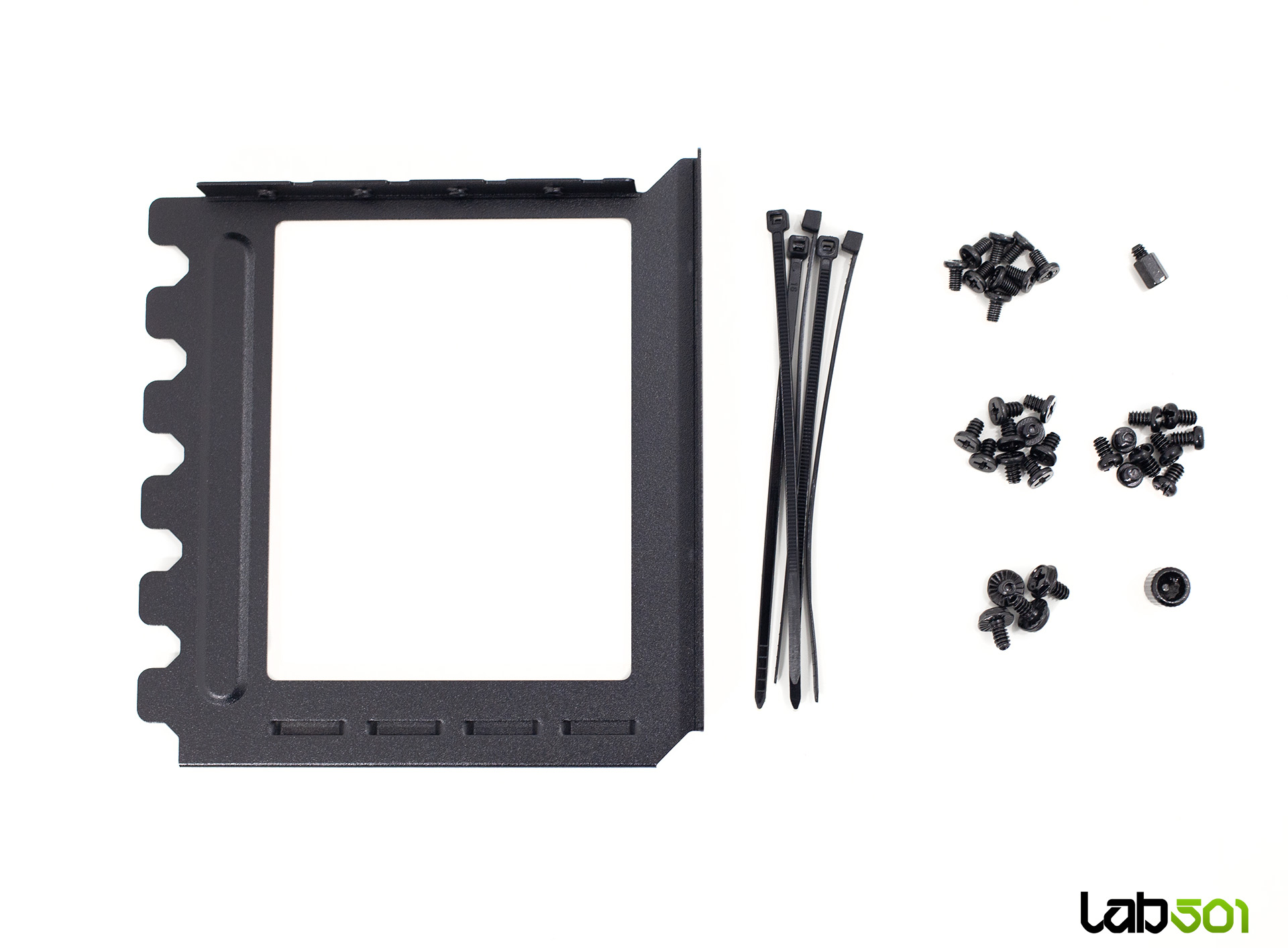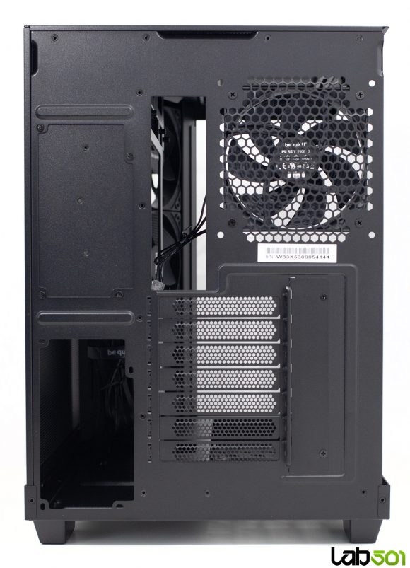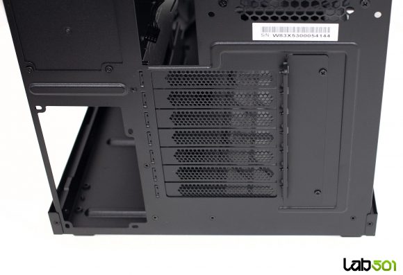 In partea din spate a carcasei gasim zona modulara a sloturilor de expansiune (7 orizontale + 4 verticale), zona porturilor I/O ale placii de baza, montantul ventilatorului din spate, spatiul destinat sursei, precum si spatele bracket-ului pentru unitatile de stocare. Reluand ideea din introducere, aceasta poate fi mutata in locul sursei, la nevoie (vom vedea in detaliu pe pagina urmatoare). Pachetul de accesorii este destul de simplu si include tot ce are nevoie un utilizator odata ce porneste la drum: manualul de utilizare, un bracket modular ce permite instalarea VGA-ului in pozitie verticala, bride de prindere, precum si suruburile necesare instalarii placii de baza, a ventilatoarelor si a unitatilor de stocare (HDD si SSD).