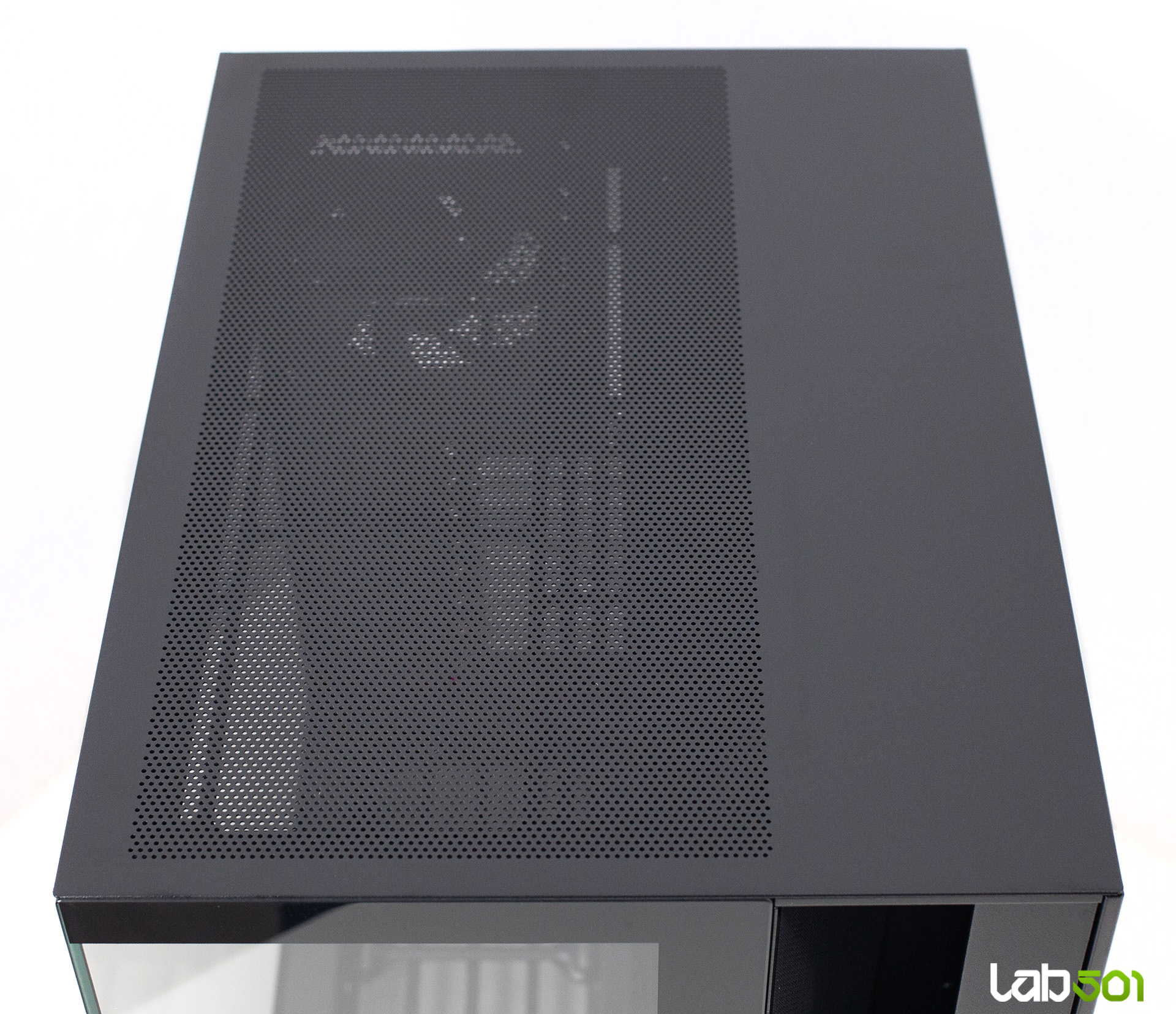 Zona de control a carcasei este amplasata tot frontal, fiind dispusa pe latime si usor accesibila chiar si atunci cand carcasa este asezata pe podea sau pe birou. Dotarile zonei de control sunt moderne si includ: un LED pentru HDD, un port USB 3.2 Gen 2 Type-C, doua porturi USB 3.2 Type-A, un buton Power, o mufa TRRS si butonul Reset. Cele doua panouri din otel, lateral si superior, prezinta perforatii pentru un airflow cat mai bun. Desi acestea nu sunt prevazute cu filtre de praf, sistemul de atasare la sasiu este unul sigur, de tip „bulbi”.