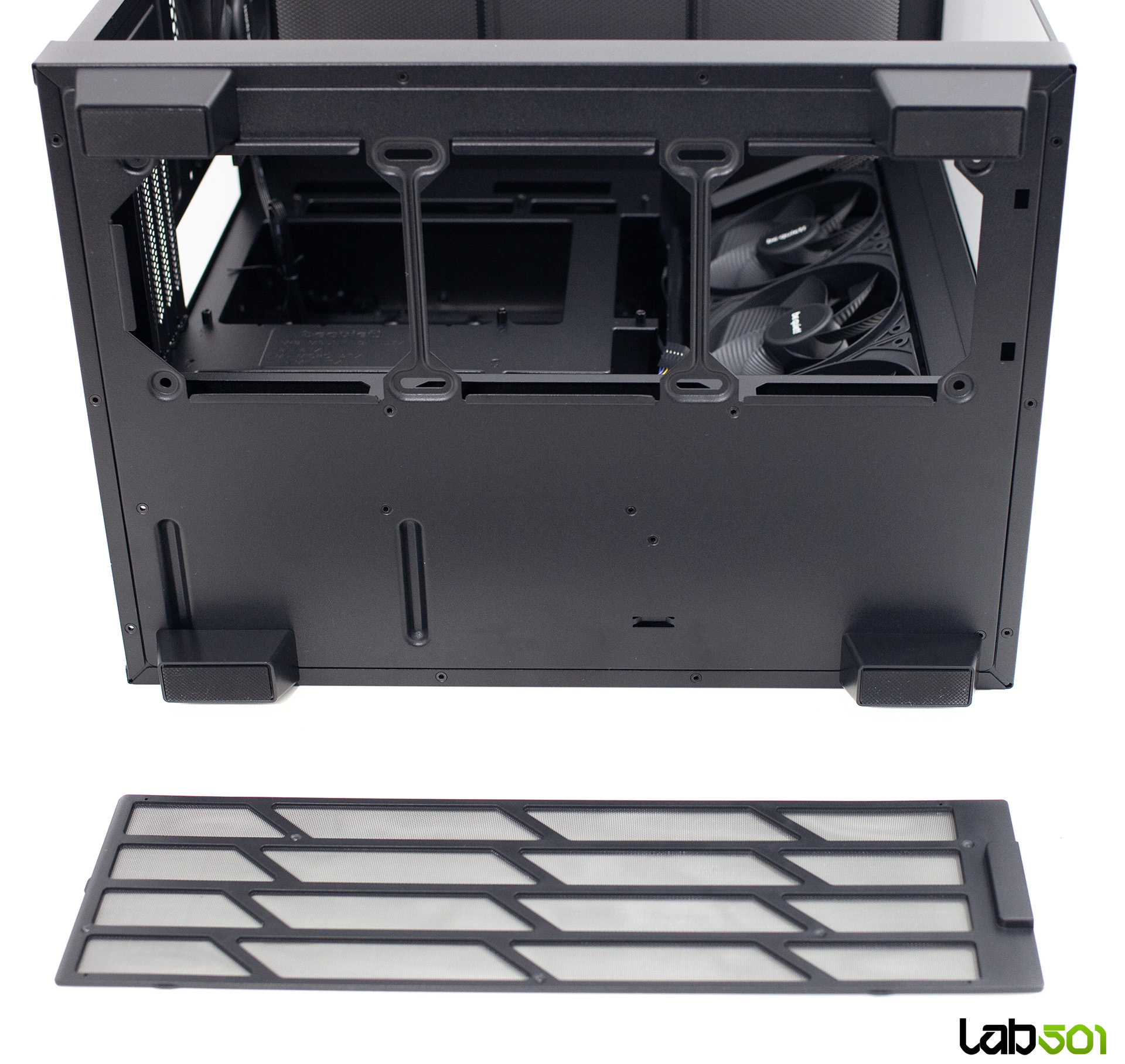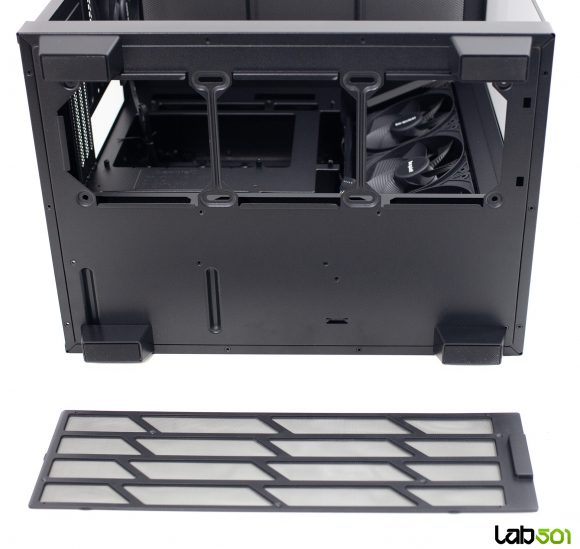 Pe langa filtrul de praf magnetic frontal, producatorul a prevazut si in zona podelei un filtru de praf din nylon, tip sertar, accesibil prin partea din fata a carcasei. Tot aici se poate observa zona picioarelor, care dispun de pad-uri cauciucate de buna calitate, aplicate pentru a asigura atat stabilitate ansamblului, cat si protectie impotriva zgarieturilor. Intr-adevar, acestea nu au lasat urme pe biroul nostru alb in urma manipularii.