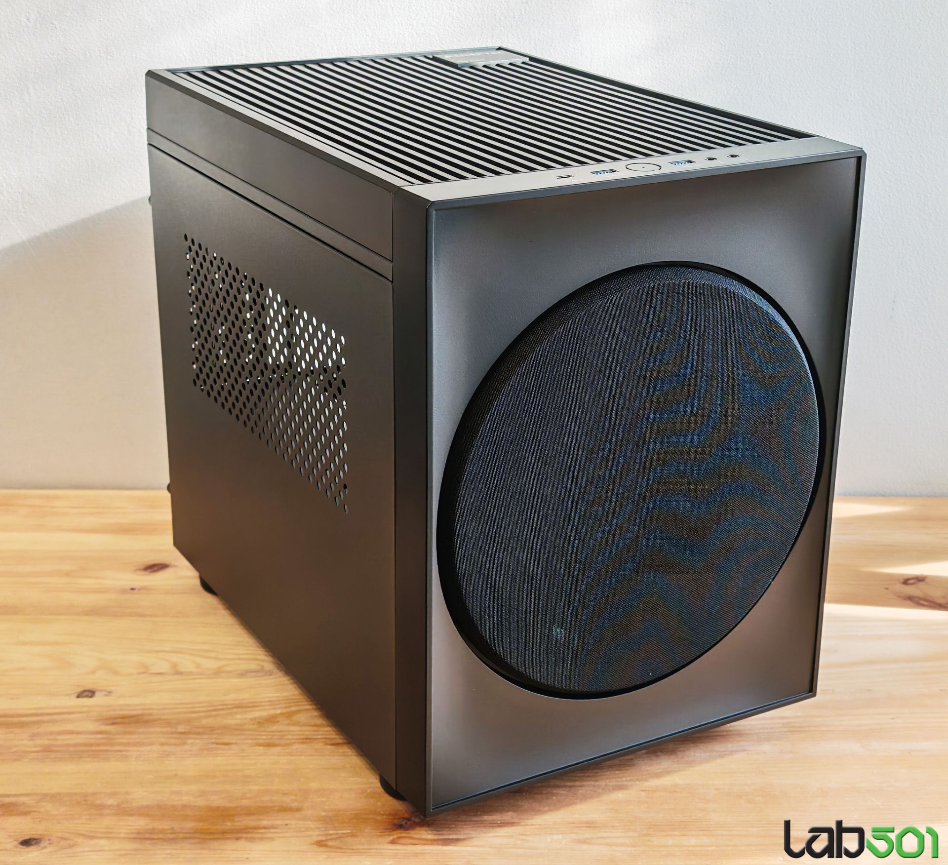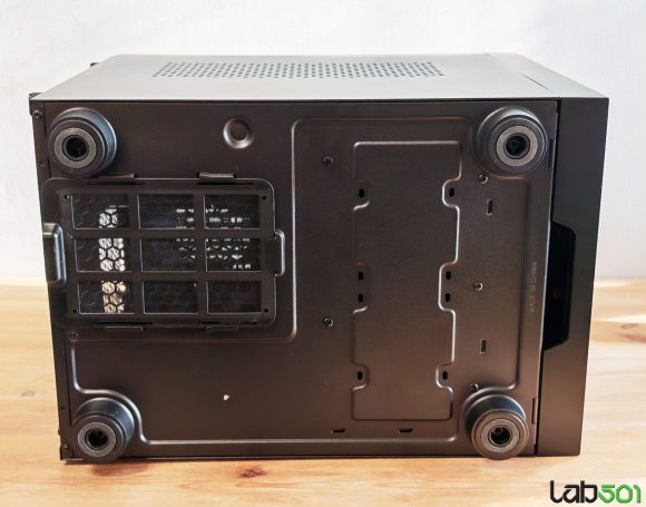 Evident, The Cube este gandita pentru sisteme elegante de mici dimensiuni, usor de asamblat, datorita mecanismului culisant. Pe langa latura frontala, unde avem de-a face cu un filtru de praf circular, similar cu ceea ce vedem in cazul difuzoarelor, fara metal perforat intre acesta si ventilator, The Cube are inca 3 laturi perforate, pentru obtinerea unui flux de aer cat mai generos. Este vorba despre latura superioara, o zona de pe laterala stanga si o zona de pe latura inferioara, toate 3 fiind protejate cu ajutorul unor filtre de praf dispuse pe interior. In cazul sursei, filtrul de praf a fost montat pe exterior, pentru a putea fi inlaturat si curatat cat mai usor.