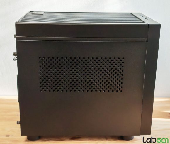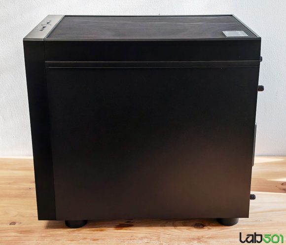 Cele doua laterale sunt construite din otel SECC cu o grosime de 0.6mm – personal as fi apreciat si o varianta cu un geam lateral. Zona de control (“panoul frontal”) este pozitionata pe latura superioara a carcasei, fiind usor accesibila indiferent daca pozitionam carcasa pe podea sau pe birou. Aici gasim un conector USB-C 10Gbps, 2 conectori USB 5Gbps, conectorii audio In/Out, precum si butonul Power.
