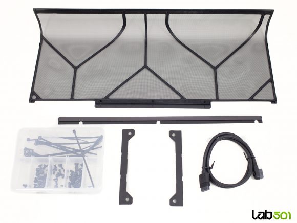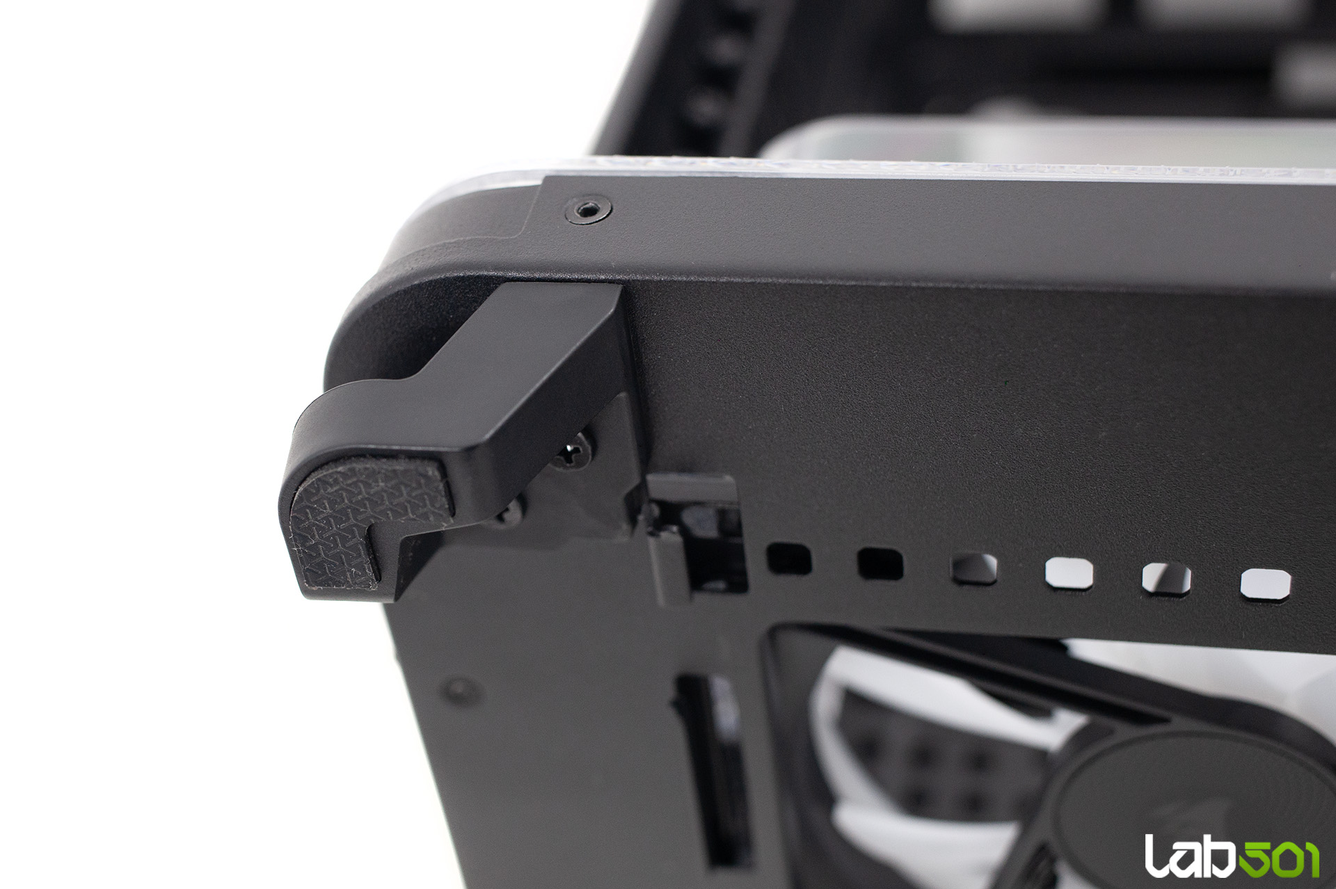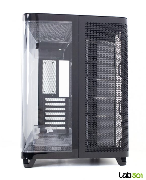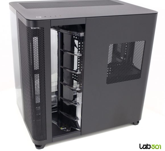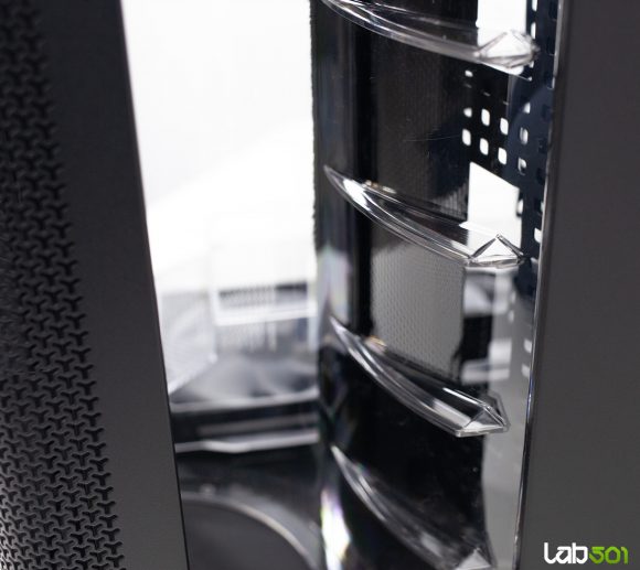 Mai mult de atat, ambele panouri laterale sunt securizate si protejate atat in timpul transportului, cat si in timpul manipularii acesteia, odata scoasa din cutie, prin integrarea unor suruburi in mecanismul de deschidere, in balamale. Chiar si odata scoase suruburile de siguranta, panoul metalic frontal amplasat deasupra balamalelor si a panourilor le va “tine” in loc, astfel ca acesta trebuie scos inainte de a scoate panourile laterale. Panoul frontal curbat din sticla securizata nu poate fi deschis independent, neavand o zona pentru degete prevazuta in sasiul podelei, asa cum este cazul pentru ambele panouri laterale. Da, si panoul frontal curbat din sticla securizata se poate scoate (suruburi de prindere + sistem tip “carling”) si este chiar indicat sa facem acest lucru inainte de a incepe sa construim efectiv un sistem in interior.
