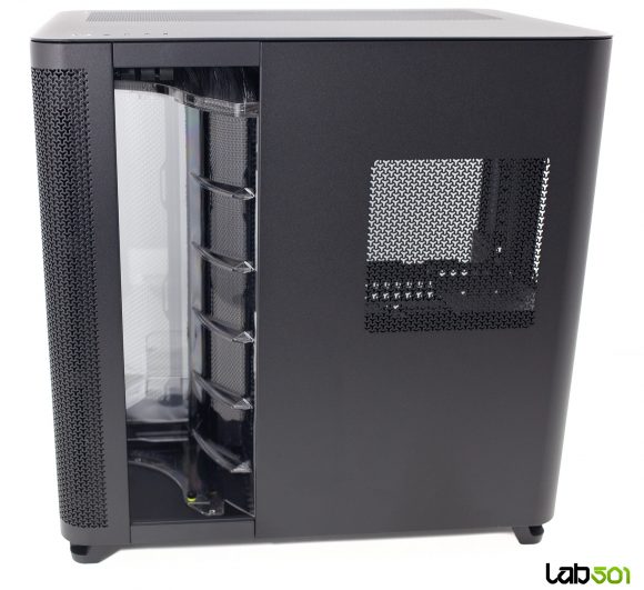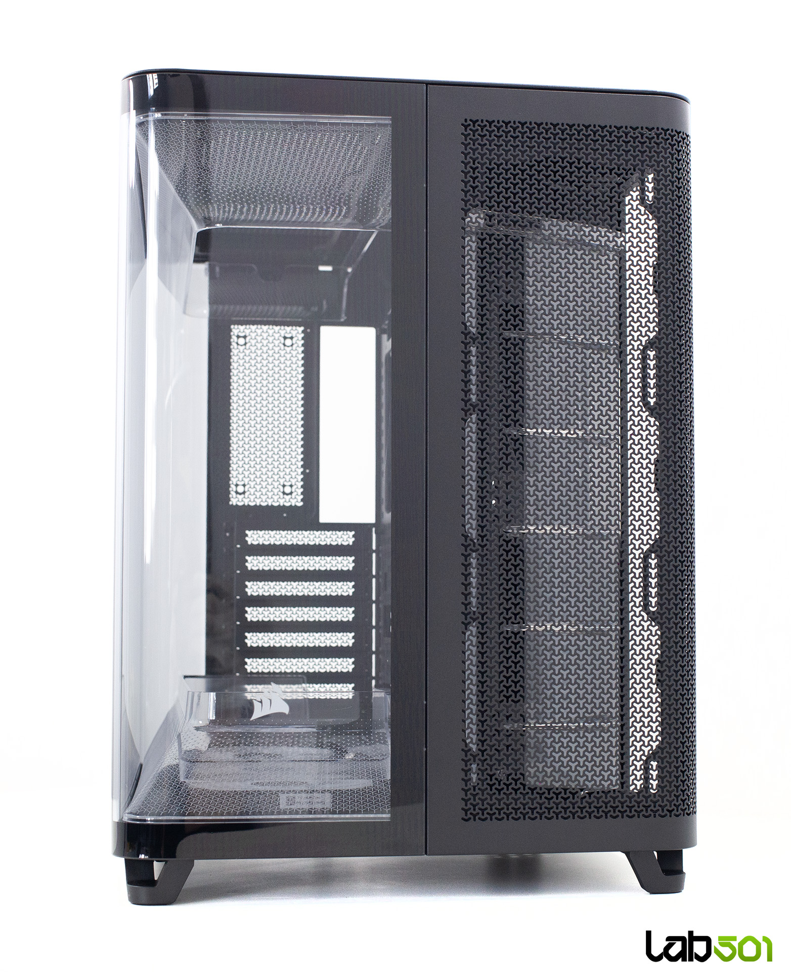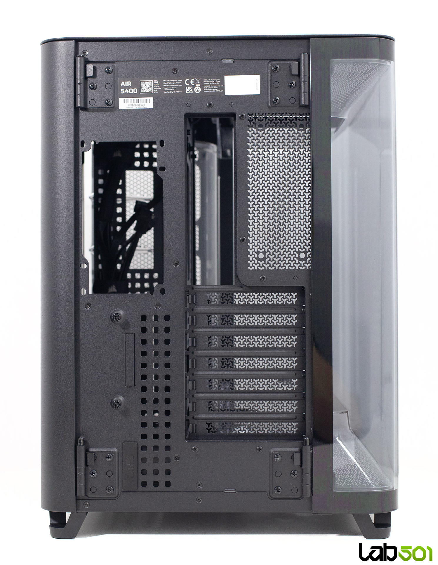 Corsair AIR 5400 LX-R RGB are un aspect masiv si solid, datorita structurii late impuse de cele trei camere interne, insa Corsair a “imblanzit” vizual volumul generos prin imbinarea elementelor din sticla securizata si otel profilat, concentrandu-se totodata pe forme mai rotunjite, cat si pe mecanisme de prindere cat mai discret amplasate si implementate. Panourile laterale curbate din sticla securizata acopera atat zona frontala, laterala, dar si o parte din zona din spate a carcasei, creand astfel o fereastra panoramica cu un unghi de deschidere mult mai amplu decat intalnim de obicei, prin care putem zari clar compartimentul central al placii de baza si al placii video, dar si compartimentul dedicat racirii procesorului.