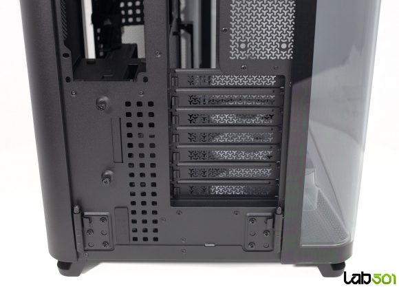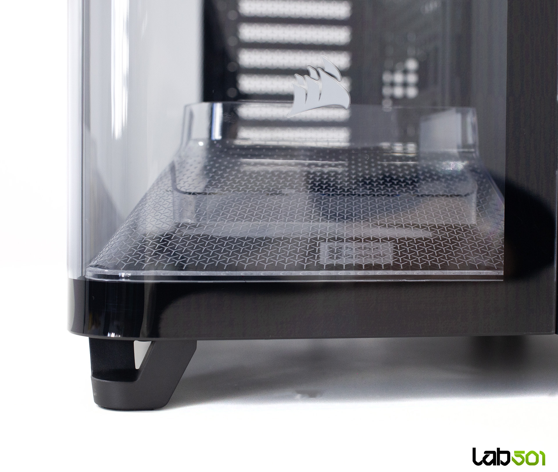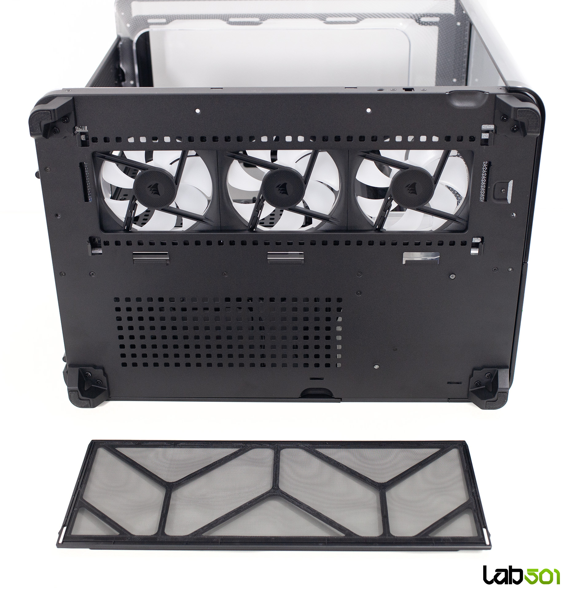 Pe partea din spate, avem cele 7 sloturi de expansiune orizontale pentru placa video, balamalele panourilor laterale si decupajul sursei de alimentare ce corespunde celei de-a treia camere. Observam ca lipseste montura clasica a ventilatorului din spate – o alegere intentionata, avand in vedere ca evacuarea aerului cald se face atipic in cadrul acestui design – pasiv, prin plafon. Cu toate acestea, Corsair a inclus in pachetul de accesorii doi suporti metalici care se instaleaza pe un ventilator de 120 mm, iar acestia se ataseaza ulterior de partea din spate a sasiului. Pe podeaua carcasei, Corsair a integrat un filtru de praf tip sertar din nylon, ce acopera zona de intake a ventilatoarelor si se scoate prin lateral. Pad-urile cauciucate prevazute pe picioarele carcasei nu lasa urme pe suprafete, indiferent cat o vom misca.