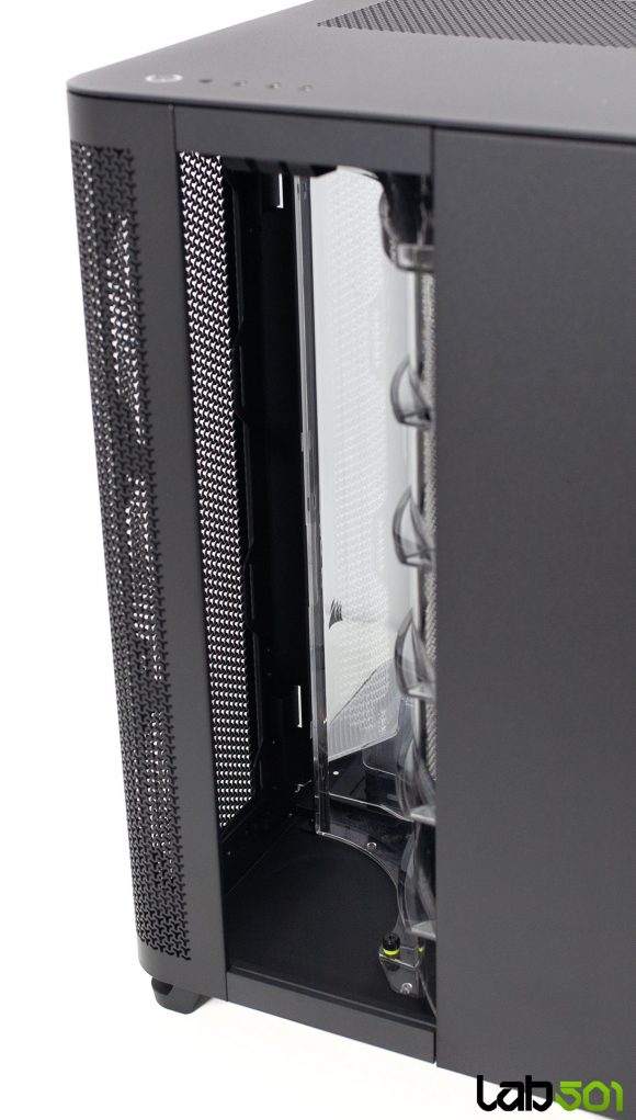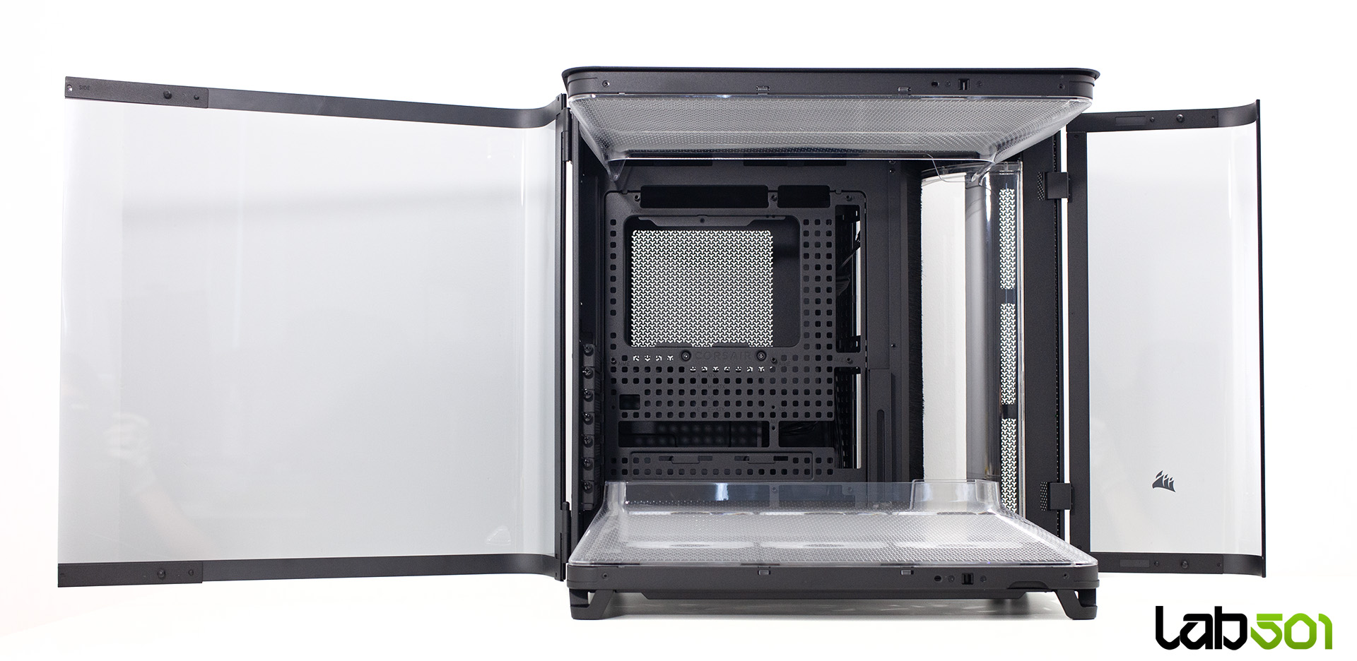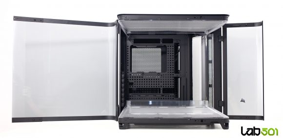 Dincolo de aerul elegant dat de curbura panourilor din sticla securizata, inginerii Corsair au optat pentru implementarea unor mecanisme moderne de deschidere pentru acestea (tip usi franceze), ascunse (creand loc pentru degete in zona podelei pentru deschiderea panourilor laterale) si amplasate strategic (balamale ce par a face parte din sasiu). Chiar si atunci cand ne uitam la mastile din otel profilat aflate frontal, dar si pe plafon, gasim un sistem simplu, eficient si rapid de tip “tragere”.