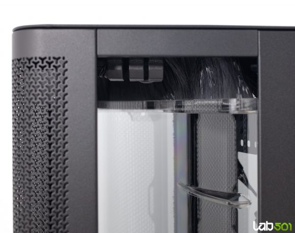 Fiind o carcasa tricamerala cu accent pe partea de airflow, camera frontala destinata racirii procesorului a fost conceputa pentru instalarea unui radiator de pana la 360 mm, ce va trage aer direct prin panoul metalic frontal. In pachetul de accesorii gasim, printre altele, si un filtru de praf din nylon dedicat acestui panou, desi acesta nu vine cu filtrul de praf instalat din fabrica. Corsair recomanda utilizarea radiatorului fara filtru de praf pentru a maximiza performanta acestuia, curatandu-l, in schimb, mult mai des decat am face-o in mod obisnuit. Cu toate acestea, indiferent de preferintele personale pentru un filtru de praf in aceasta zona, zona CPU-ului si cea a placii video sunt izolate una fata de cealalta printr-o masca din plastic, ce prezinta perii din nylon in partea superioara, facilitand astfel trecerea furtunelor radiatorului si retinand totodata impuritatile. Asadar, indiferent de preferinte, masca din plastic separatoare ce delimiteaza cele doua zone, impreuna cu canalele de directionare a evacuarii aerului cald emis de radiator, va necesita o curatare periodica de praf.