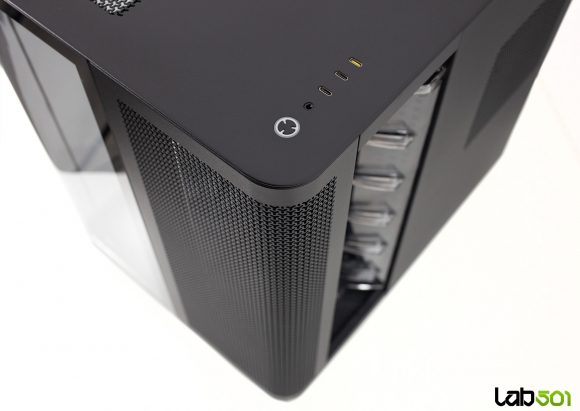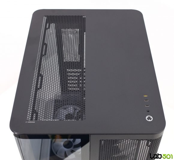Panoul I/O se afla pe plafon si prezinta un buton de Power iluminat, un port combo pentru microfon si casti, 2 porturi USB 3.2 Gen 1 Type-C si un port USB 3.2 Gen 2 Type-C. Da, trei porturi USB-C (cineva din redactie sigur e fericit!), dintre care doua standard 5 Gbps si unul 20 Gbps pentru periferice de mare viteza sau stocare rapida. Este o alegere indrazneata din partea Corsair sa renunte complet la porturile USB Type-A in favoarea USB-C, semn ca AIR 5400 tinteste un public pregatit pentru cele mai noi tehnologii.
