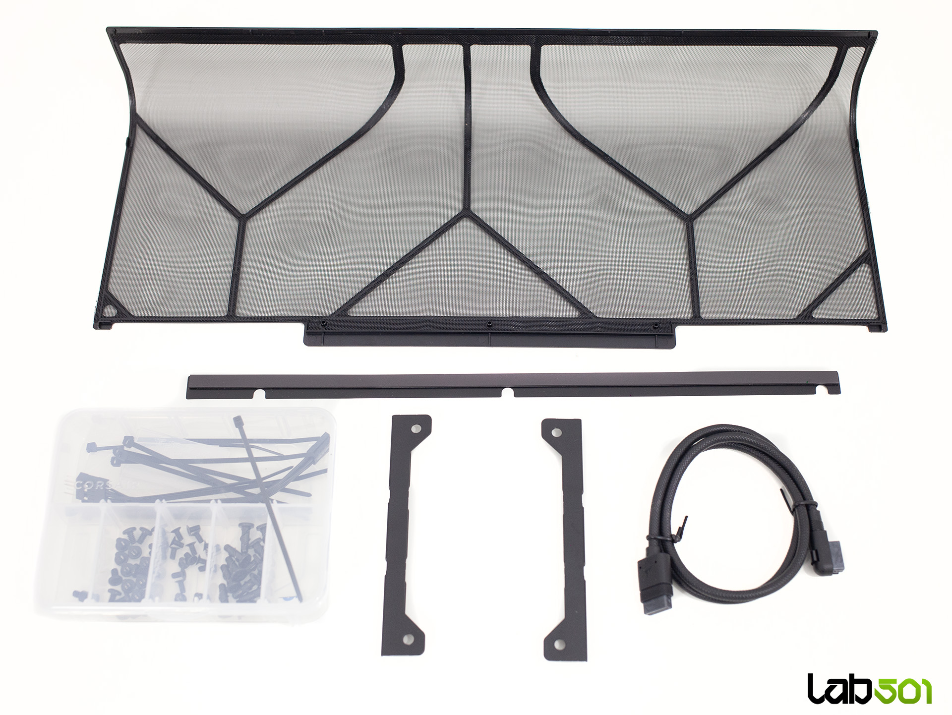 In cele din urma, pe langa filtrul de praf curbat din nylon si cei doi suporti metalici pentru instalarea unui ventilator pe partea din spate, mai avem inclus in pachetul de accesorii un organizator din plastic ce contine suruburile necesare pentru instalare, soricei de prindere din plastic, o banda magnetica pentru estetica placii de baza atunci cand se instaleaza o placa tip BTF, un adaptor I/O si un distantier din cauciuc pentru VGA.