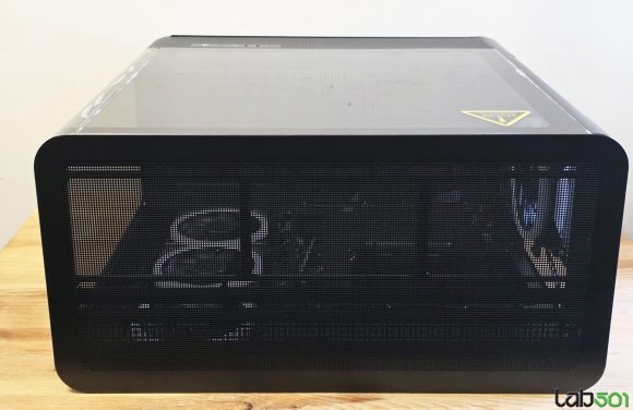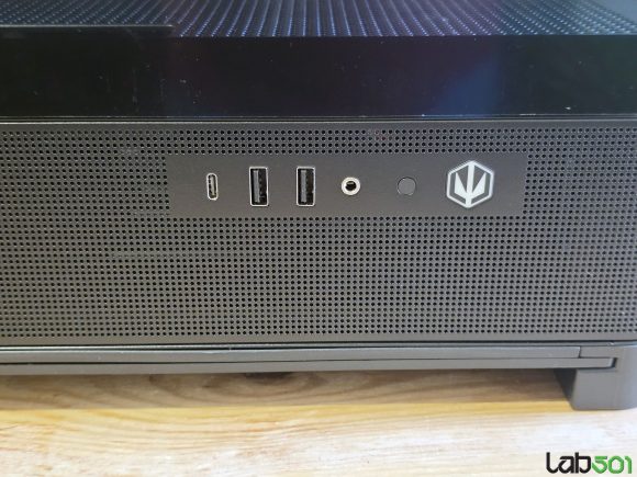 Practic, compartimentul placii de baza este inconjurat pe doua laturi de sticla, in timp ce compartimentul sursei este inconjurat pe doua laturi de otel perforat, pentru o circulatie mai buna a aerului in interior. Conectorii frontali sunt pozitionati pe latura stanga a carcasei, in zona metalica, aici fiind dispusi doi conectori USB 3.2 Gen 1, un buton Power, un conector audio in/out, precum si un conector USB 3.2 Gen 2 TypeC.
