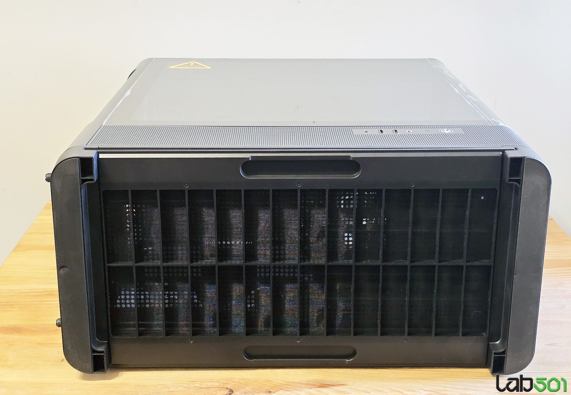 Pe latura inferioara gasim un filtru de praf de mari dimensiuni, care protejeaza toata lungimea carcasei, inclusiv zona sursei. De asemenea, latura superioara este alcatuita dintr- bucata de metal perforat, care poate fi indepartata cu usurinta, acest lucru fiind necesar pentru a inlatura geamul lateral.