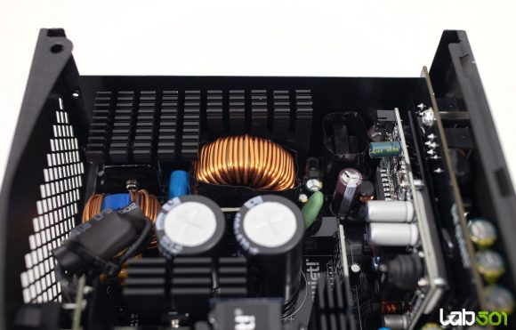 In etajul primar sunt utilizati doi condensatori Teapo din seria LS, de 470µF / 400V fiecare, rezultand o capacitate totala de 940µF. Pe secundar regasim o combinatie de condensatori electrolitici Teapo (seria SC) si Nippon Chemi-Con (seria KZE), alaturi de condensatori polimerici ChinSan (Elite), utilizati pentru filtrarea eficienta a tensiunilor de iesire.