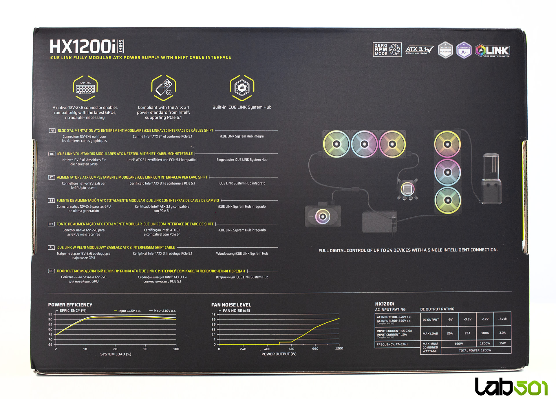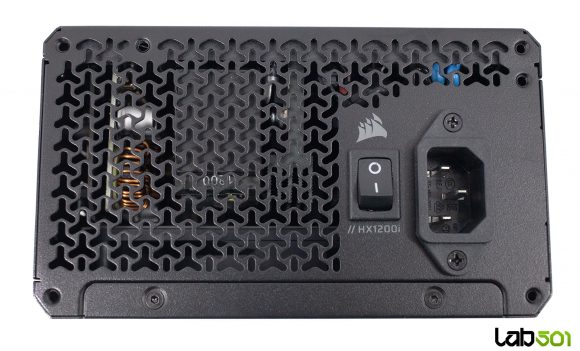 Pe langa aceste iesiri, in partea din spate (unde sunt amplasati conectorii modulari la sursele normale) regasim doua porturi speciale iCUE LINK (canal A si B), permitand ca sursa sa functioneze ca hub pentru ventilatoare, pompa, AIO sau alte elemente RGB. In imediata apropiere se afla si mufa USB-C prin care sursa comunica cu software-ul iCUE (folosind headerul intern USB 2.0 al placii de baza). Pe partea din spate avem doar conectorul de alimentare IEC standard si intrerupatorul On/Off. Nu exista un comutator fizic pentru modul de operare al railurilor de 12 V (single/multi-rail) sau pentru modul de ventilatie, intrucat aceste functii sunt gestionate prin intermediul aplicatiei iCUE.