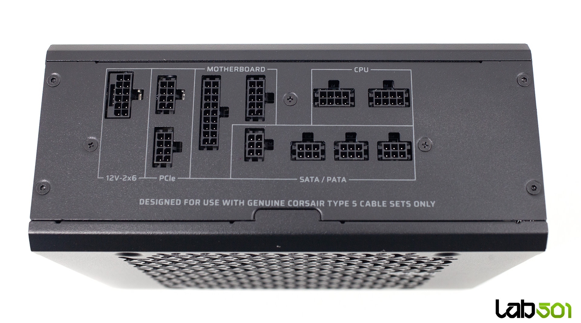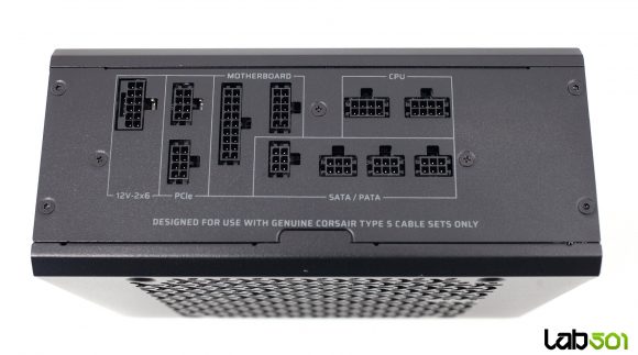 Corsair HX1200i SHIFT impresioneaza inca de la exterior prin designul sau atipic fata de sursele conventionale. Carcasa este finisata in negru mat, cu perforatii ample pe partea inferioara (zona ventilatorului de 140 mm) si pe spate, pentru evacuarea aerului cald. Elementul distinctiv il reprezinta insa panoul modular lateral: toti conectorii DC ai sursei sunt grupati pe o latura a unitatii, in locul panoului clasic de pe partea din spate. Aceasta abordare SHIFT faciliteaza accesul la cabluri in timpul asamblarii sau upgrade-urilor, permitand conectarea si deconectarea firelor direct din lateralul carcasei, fara a mai demonta sursa sau a forta spatiul din spatele tavitei placii de baza.