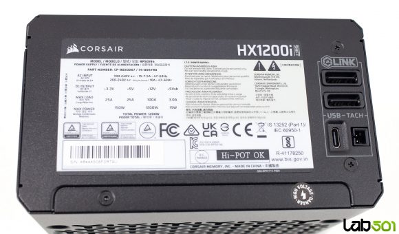 Pe una din lateralele sursei putem gasi eticheta cu specificatiile electrice – linia de +12v are o configuratie single-rail, putand furniza toata puterea sursei, mai exact 100A (1200W). Rail-urile de +3.3 si +5v sunt derivate DC-to-DC din +12v fiind cotate la 25A, impreuna putand livra un maxim de 150W, fiind mai mult decat suficient, tinand cont de faptul ca in sistemele moderne principalii consumatori se alimenteaza de la +12v.