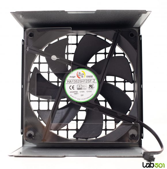 Ventilatorul de 135 mm poarta codul HA13525H12SF-Z, este fabricat de Hong Hua si este echipat cu lagar FDB (Fluid Dynamic Bearing), avand o turatie maxima de 2300 RPM. In lipsa unui mod semi-pasiv de functionare, acesta ramane activ in permanenta, insa este destul de potolit pe parcursul testelor, asa cum vom vedea pe pagina urmatoare.