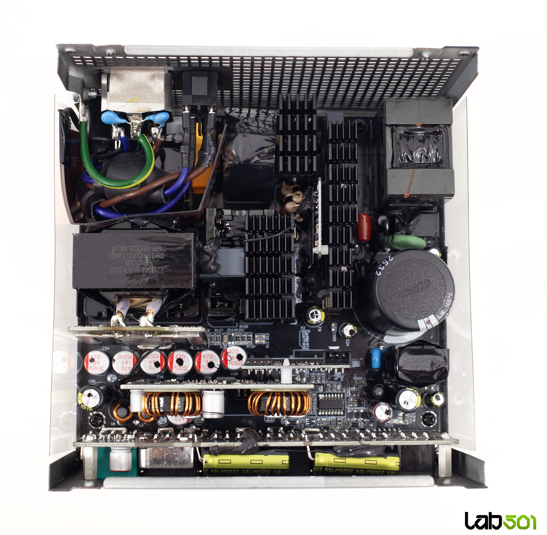 In secundar regasim condensatori electrolitici ChengX, precum si polimerici de la ChengX si Chinsan (Elite), inclusiv pe PCB-ul destinat conversiei DC-DC. Filtrarea EMI este completa, incluzand 4 condensatori de tip Y si 2 de tip X cu circuit de descarcare, bobina de ferita pe fir, doua bobine pentru filtrare CM (common mode) si un varistor pentru protectia la supratensiuni (surge). Protectia la supracurent la pornire (inrush) este asigurata printr-un termistor NTC in paralel cu un releu de bypass, o solutie clasica si eficienta.