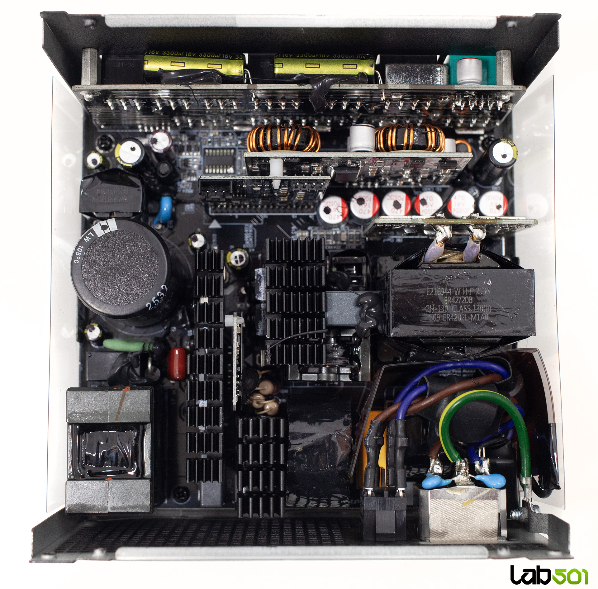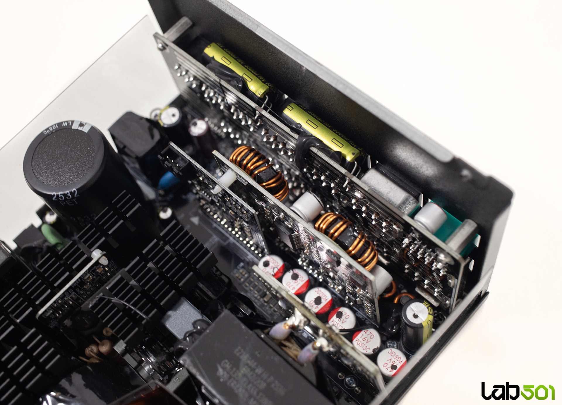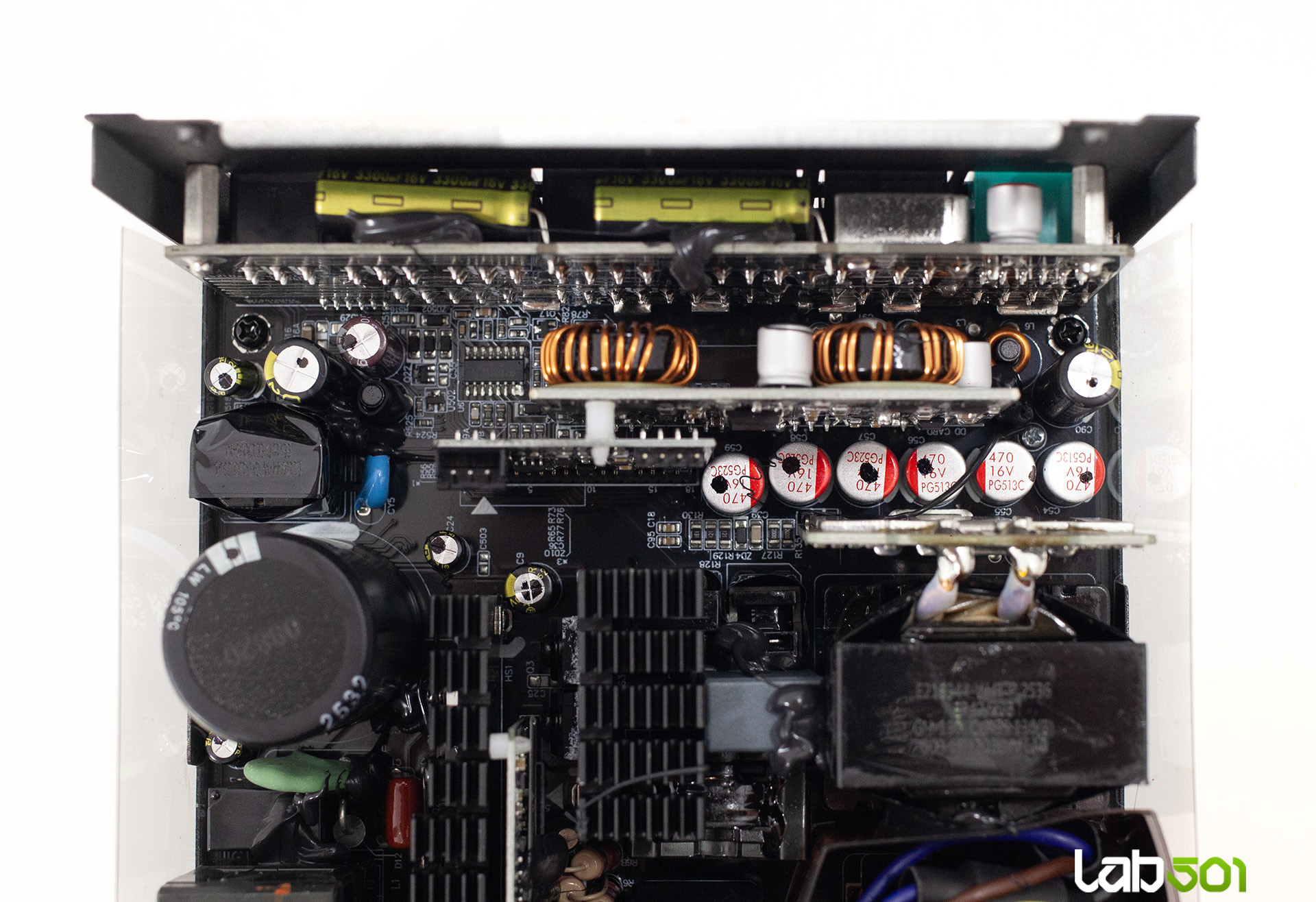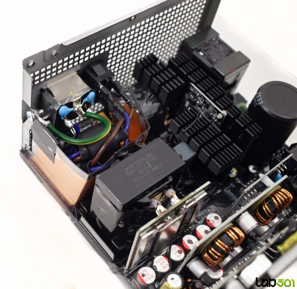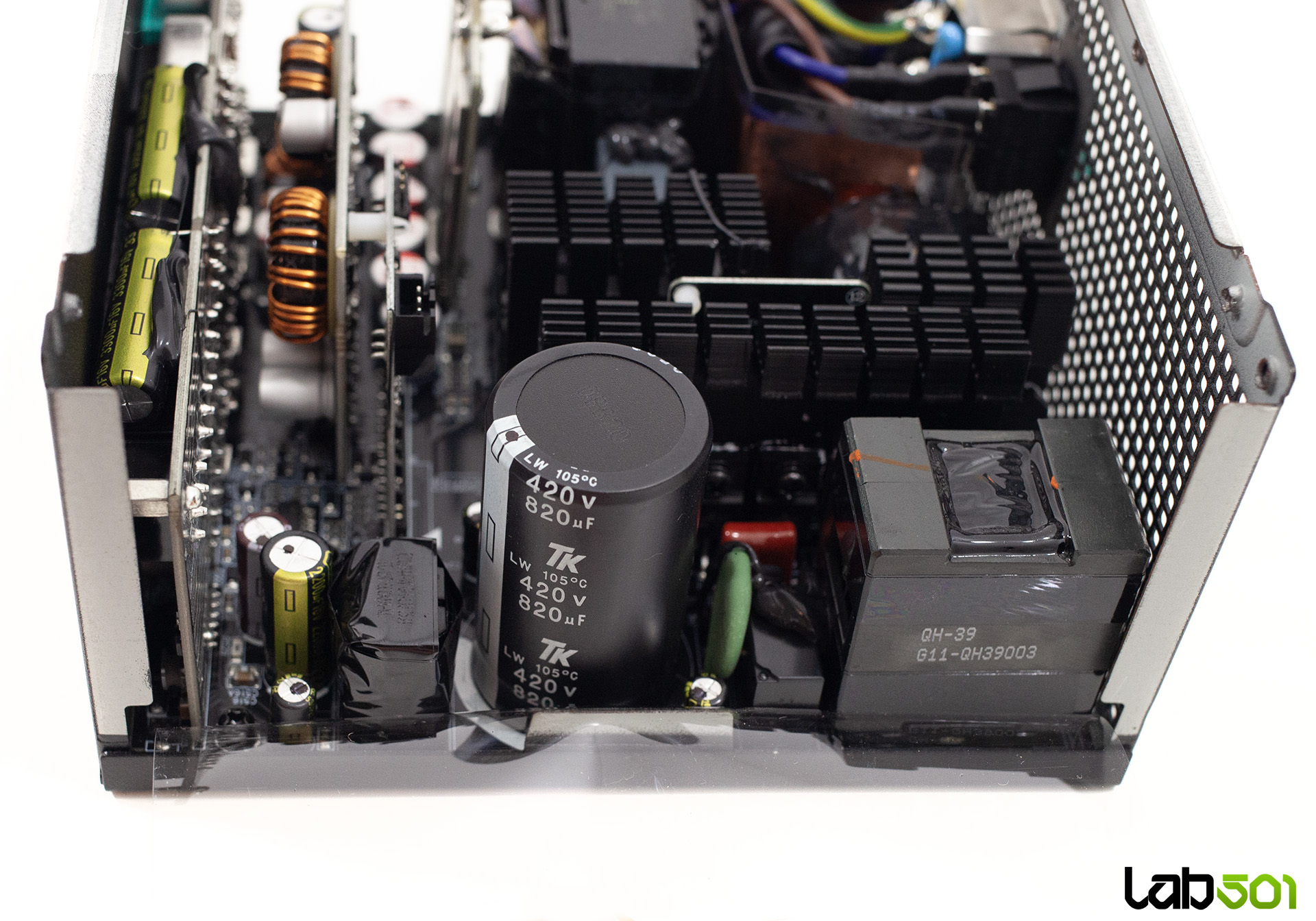 Asa cum mentionam si mai devreme, DeepCool PN1200M utilizeaza o platforma realizata de CWT, bazata pe o topologie Half-Bridge cu conversie LLC in primar, respectiv rectificare sincrona si conversie DC-DC in secundar. Condensatorul principal din primar este un model japonez TK (Toshin Kogyo) din seria LW, cu o capacitate de 820uF / 420 V – o valoare destul de redusa pentru o sursa de 1200W, dar suficienta pentru a asigura un hold-up time conform cerintelor ATX 3.1 – si un rating de 105°C.