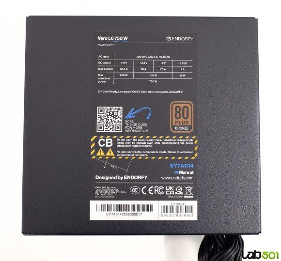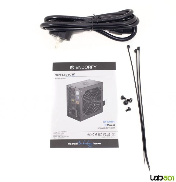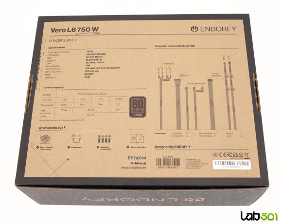In pachetul lui ENDORFY Vero L6 750W gasim strictul necesar: sursa propriu-zisa, manualul de utilizare, cablul de alimentare, suruburile de montaj, precum si cateva zip-ties pentru organizarea cablurilor. Ambalajul este simplu, dar ofera o protectie adecvata pe durata transportului. Sursa se prezinta intr-o carcasa compacta, cu o adancime de doar 140 mm, facilitand instalarea chiar si in carcase cu spatiu restrans pentru sursa. Constructia metalica este solida pentru aceasta gama de pret, iar finisajul negru mat este aplicat uniform pe toate suprafetele. Cealalta latura este simpla, purtand doar logo-ul discret al producatorului, pastrand un aspect sobru, fara artificii estetice inutile – ceea ce nu poate fi decat un lucru bun pentru o componenta amplasata, de regula, intr-un spatiu ferit privirii.