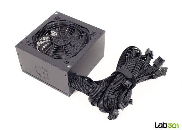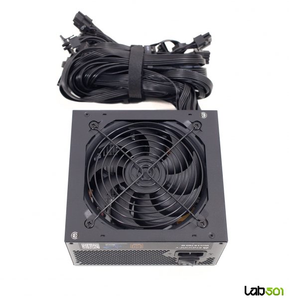 Pe una dintre lateralele sursei se afla eticheta cu specificatiile electrice – linia de +12V are o configuratie single-rail, putand furniza toata puterea sursei, mai exact 62.5A (750W). Rail-urile de +3.3V si +5V sunt derivate DC-to-DC din +12V, fiind cotate la 20A fiecare, impreuna putand livra un maxim de 100W. Aceasta capacitate este mai mult decat suficienta, avand in vedere ca in sistemele moderne principalii consumatori se alimenteaza de la +12V.