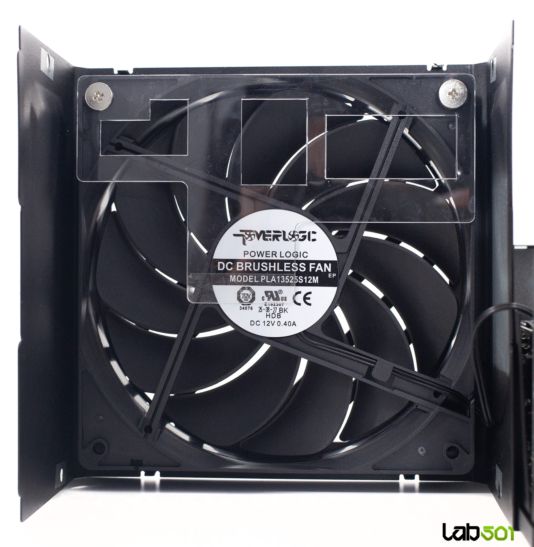 Ventilatorul de 135mm utilizat este un model Power Logic PLA13525S12M, echipat cu lagar pe lichid (FDB), specificat pentru un debit de aer de aproximativ 111 CFM si un nivel de zgomot de circa 41.6 dBA.