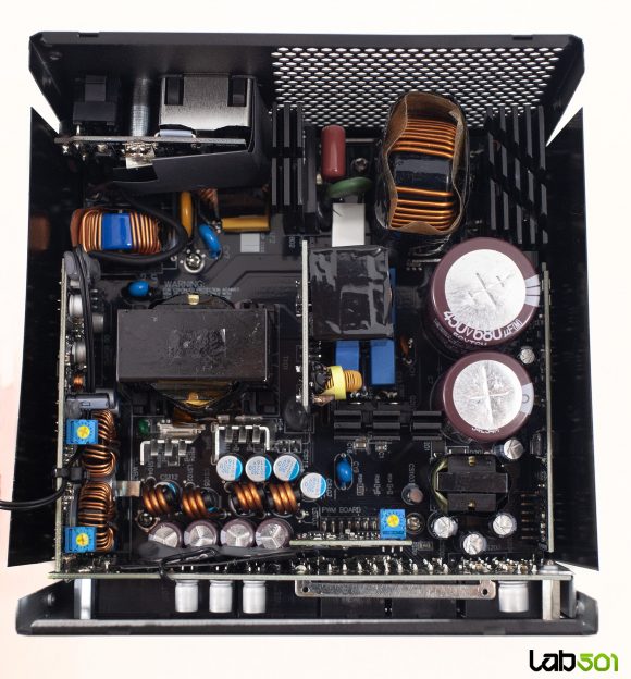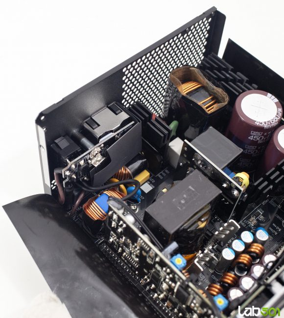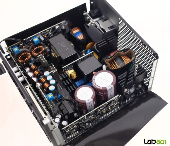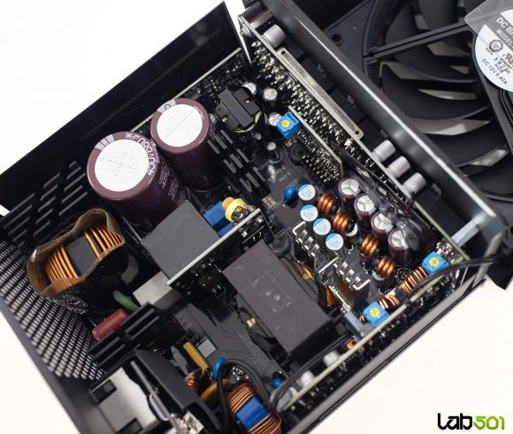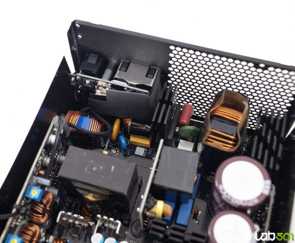 Asa cum ne puteam astepta, platforma utilizata de FSP MEGA GM 1200W ATX 3.1 este una proprietara. Pentru a obtine o eficienta ridicata si o stabilitate foarte buna a tensiunilor, MEGA GM 1200W se bazeaza pe o topologie half-bridge LLC in primar, cu redresare sincron in secundar si convertoare DC-DC dedicate pentru rail-urile de +5V si +3.3V. Cele doua VRM-uri sunt montate pe un PCB separat, dispus vertical fata de PCB-ul principal, pe una dintre laturi, perpendicular pe placa ce gazduieste conectorii modulari.