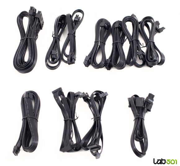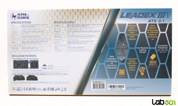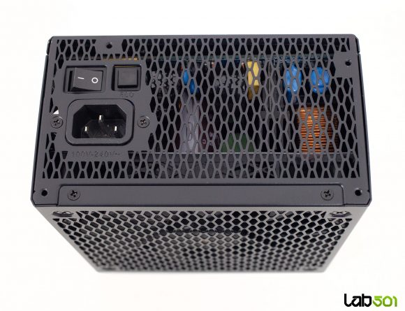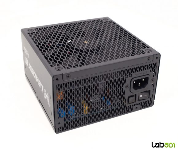 Spatele sursei respecta un layout clasic, dominat de un grilaj larg tip fagure destinat evacuarii aerului cald. In partea stanga gasim conectorul de alimentare IEC C14 si intrerupatorul On/Off, iar in partea dreapta se afla butonul fizic ECO. Fiind o sursa complet modulara, toate cablurile lui Leadex III 1000W sunt detasabile, ceea ce simplifica considerabil managementul cablajului si optimizeaza fluxul de aer in interiorul carcasei. Repartitia conectorilor si lungimile cablurilor sunt prezentate detaliat in tabelul de mai jos: