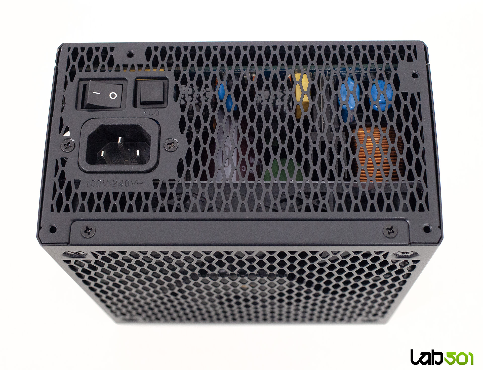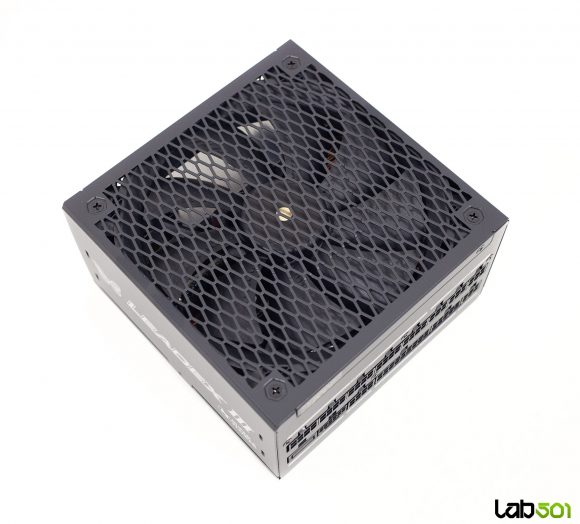 Ventilatorul beneficiaza de functionare semi-pasiva, controlata prin butonul ECO amplasat pe panoul posterior: la sarcini mici si medii, ventilatorul ramane complet oprit, sursa functionand silentios. Acesta porneste gradual doar atunci cand temperatura interna depaseste pragul de ~60°C, si se opreste din nou sub ~40-50°C. Pentru utilizatorii care prefera o racire constanta – de exemplu, in scenarii de overclocking sau in carcase slab ventilate – modul ECO poate fi dezactivat, caz in care ventilatorul va rula permanent la turatie redusa.