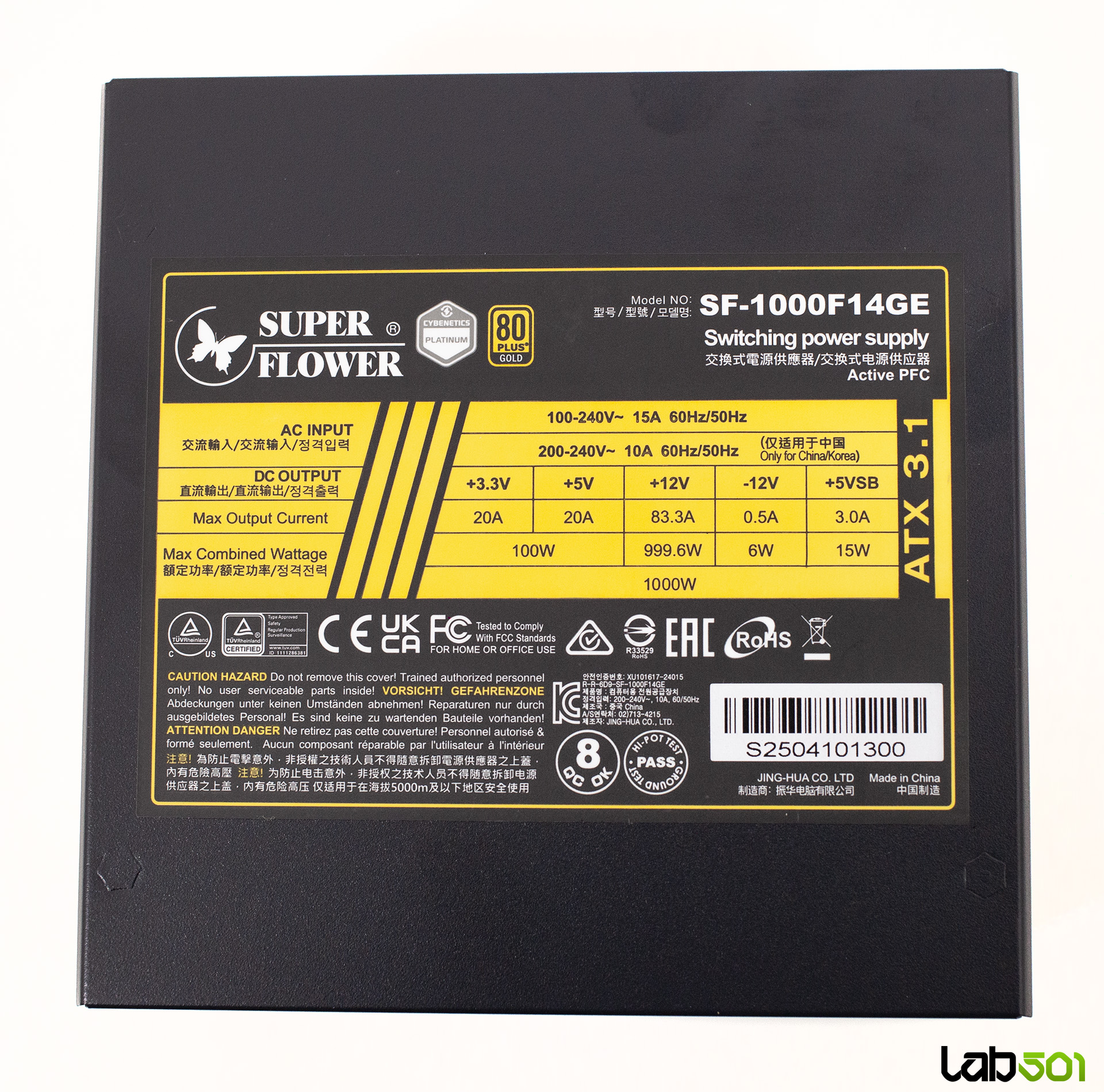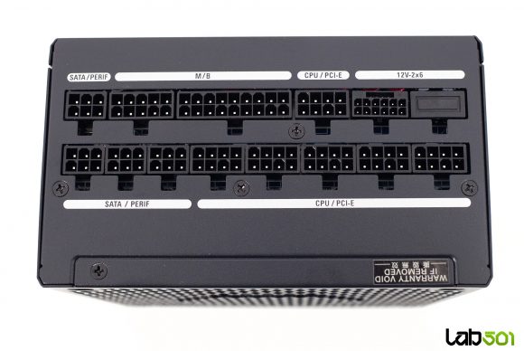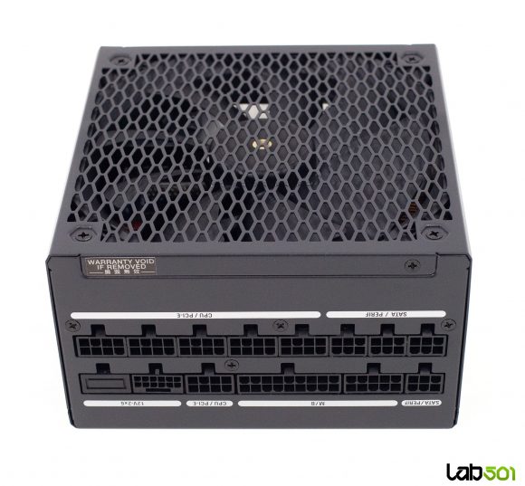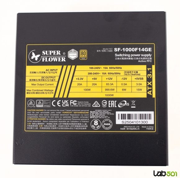 Pe partea superioara a sursei se afla eticheta cu specificatiile electrice – linia de +12V are o configuratie single-rail, putand furniza toata puterea sursei, mai exact 83.3A (1000W). Rail-urile de +3.3V si +5V sunt derivate in mod DC-DC din +12V, fiind cotate la 20A fiecare, impreuna putand livra un maxim de 100W. Aceasta capacitate este mai mult decat suficienta, avand in vedere ca in sistemele moderne principalii consumatori se alimenteaza de la +12V.