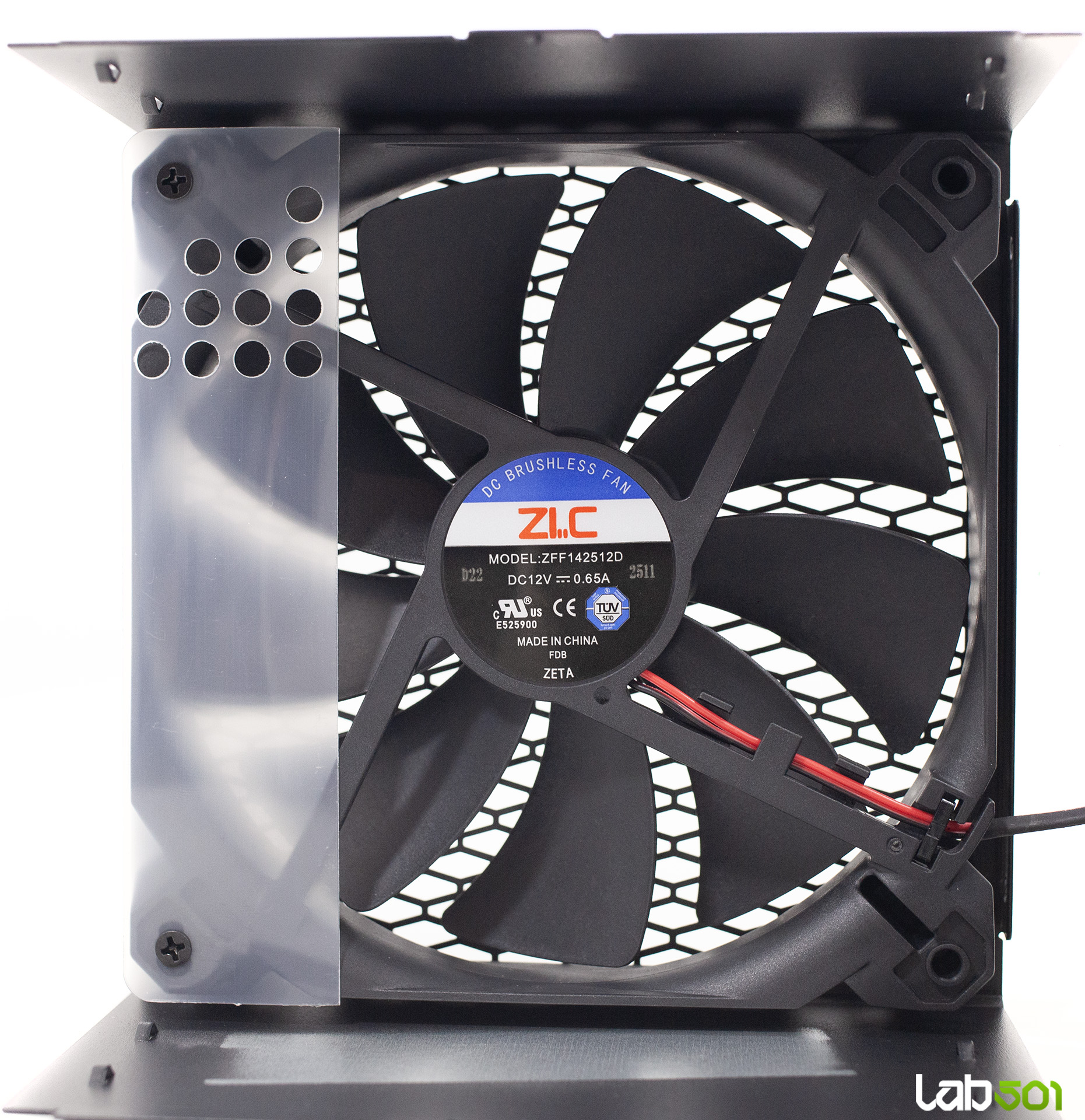Ventilatorul de 140 mm poarta codul ZFF142512D, este fabricat de ZIC si utilizeaza un lagar de tip FDB (Fluid Dynamic Bearing), avand o turatie maxima declarata de aproximativ 2000 RPM. Modul ECO, mentionat anterior, opreste complet ventilatorul la sarcini reduse, iar datorita eficientei ridicate (intre 90% si 93%, inclusiv la incarcare scazuta), componentele interne nu se incalzesc excesiv la functionarea in regim pasiv.