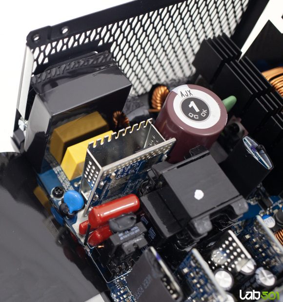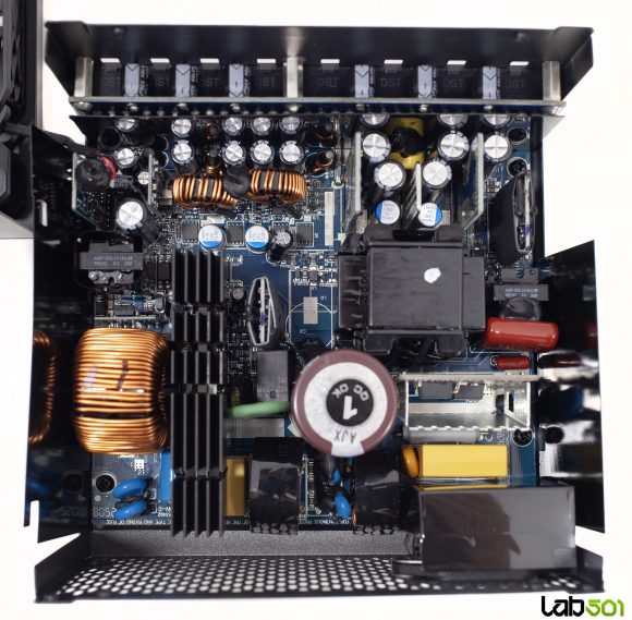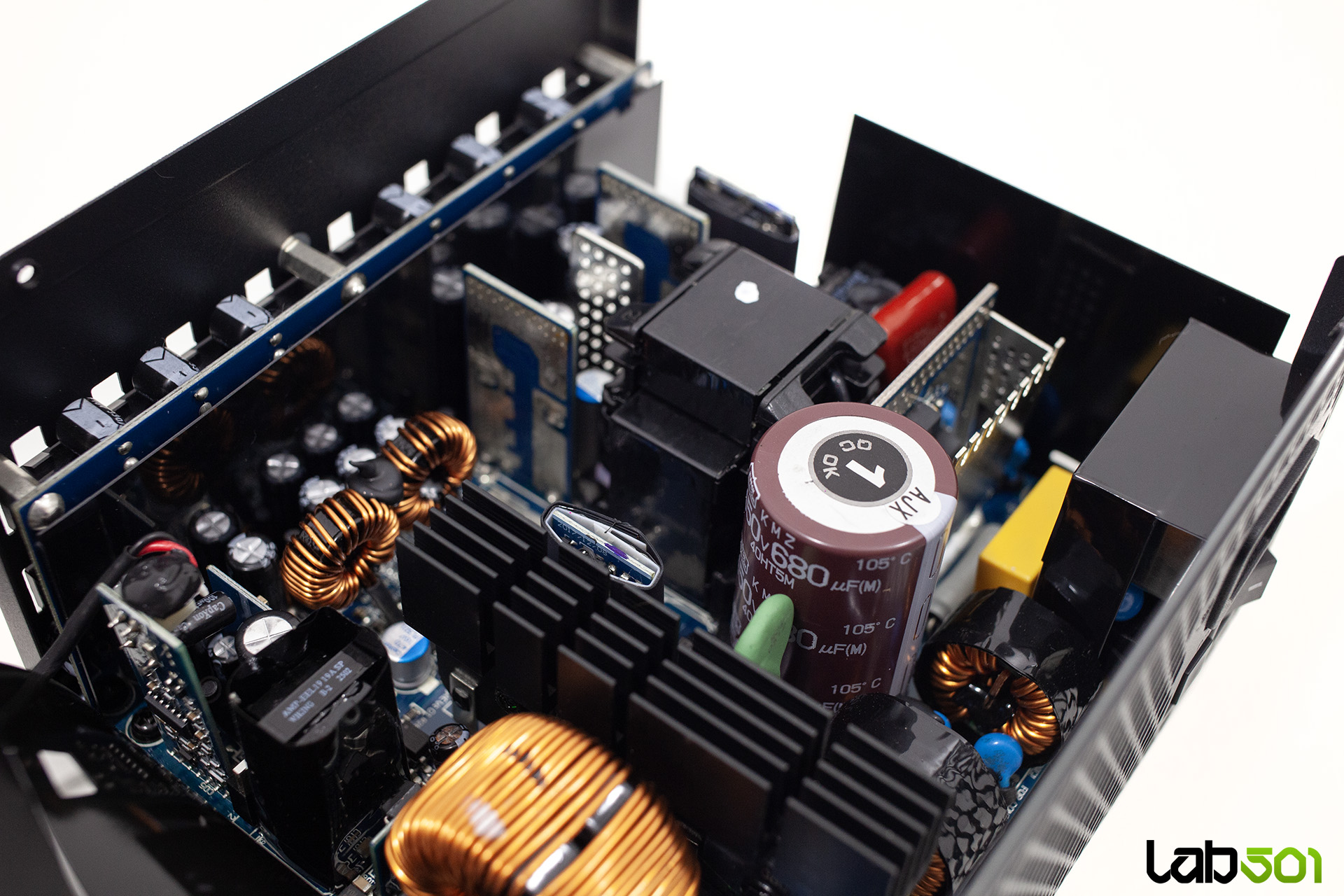 Desi nu toti condensatorii secundari sunt de origine japoneza, Superflower utilizeaza marci taiwaneze de incredere, cel mai probabil pentru a mentine un pret competitiv fara a compromite fiabilitatea. Etajele DC-DC sunt integrate direct pe PCB-ul principal, o solutie mai eleganta si mai eficienta din punct de vedere al costurilor comparativ cu implementarea pe un PCB separat – fara a afecta performanta sau racirea.