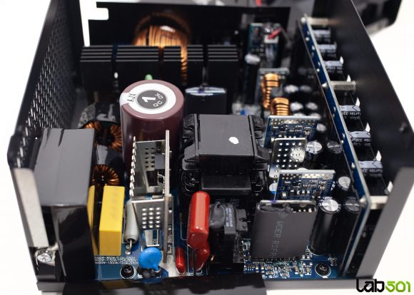 Asa cum era de asteptat, Superflower Leadex III 1000W ATX 3.1 utilizeaza o platforma proprietara bazata pe o topologie moderna, orientata spre performanta ridicata. In primar regasim un convertor rezonant LLC cu schema full-bridge, implementata cu patru tranzistori MOSFET de comutatie, iar in secundar este folosita rectificare sincron pe rail-ul de +12V – tranzistoarele MOSFET inlocuind diodele traditionale pentru a reduce pierderile de conversie.