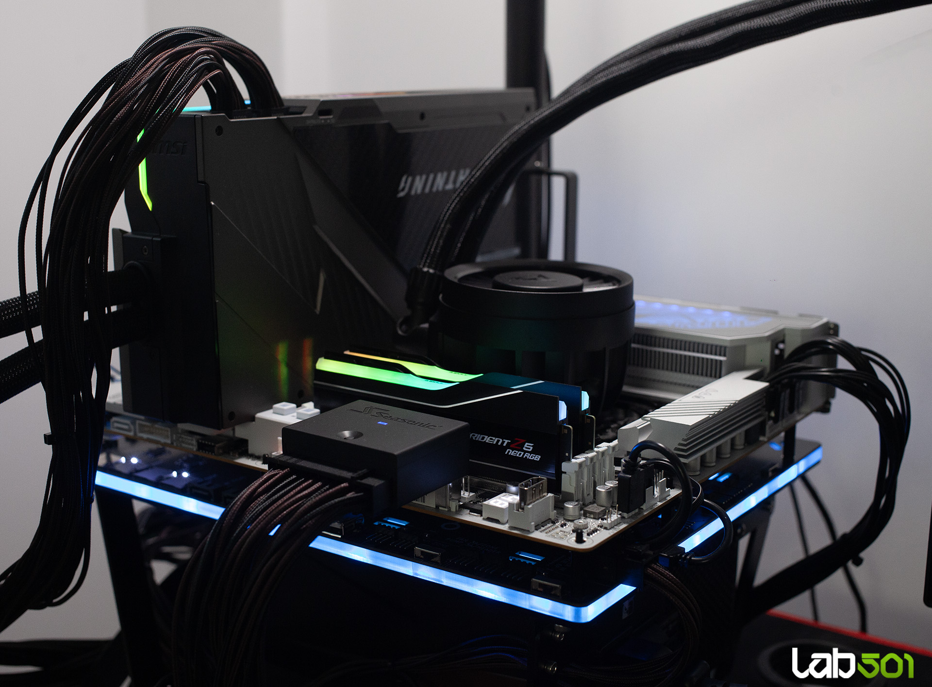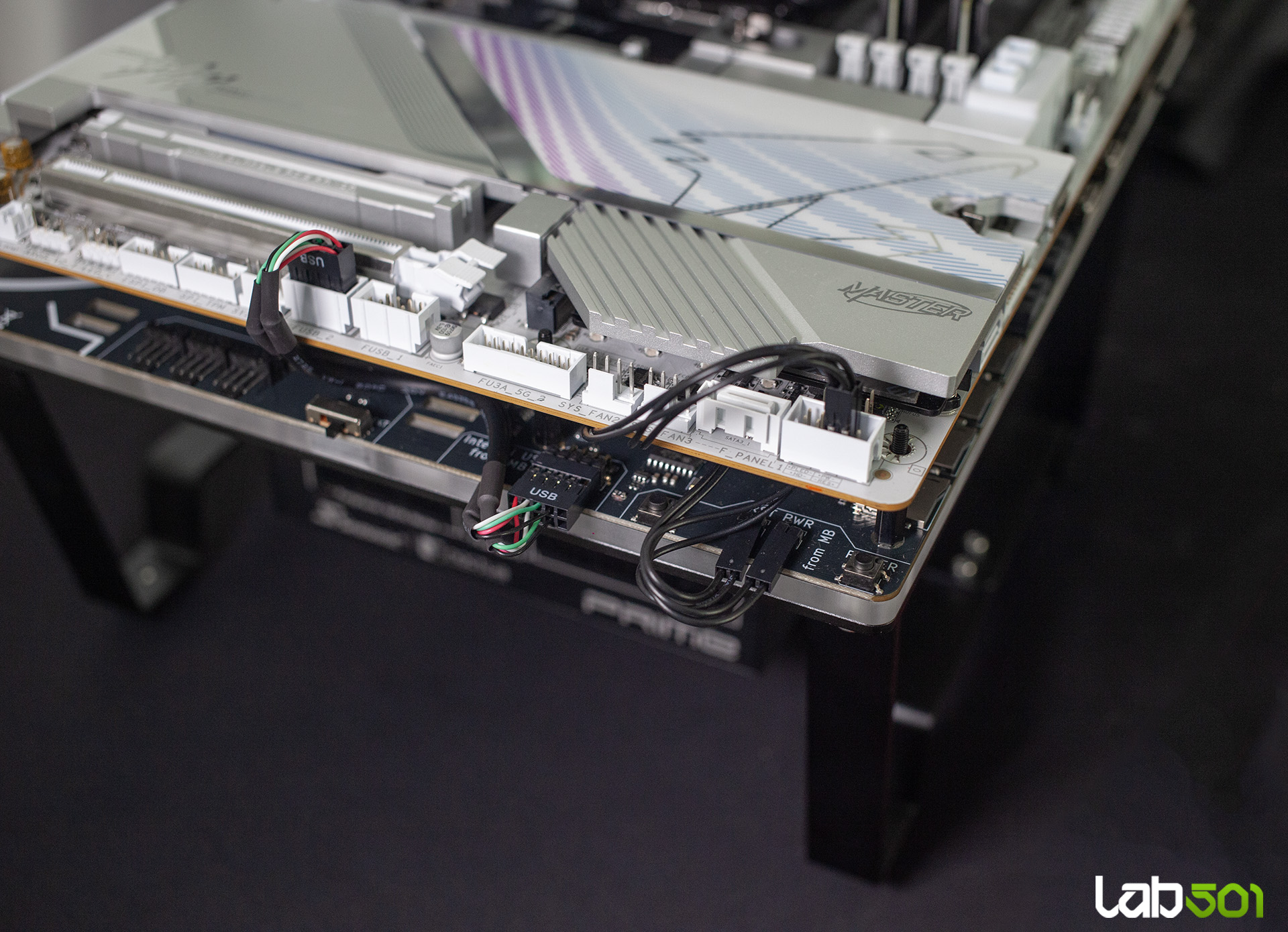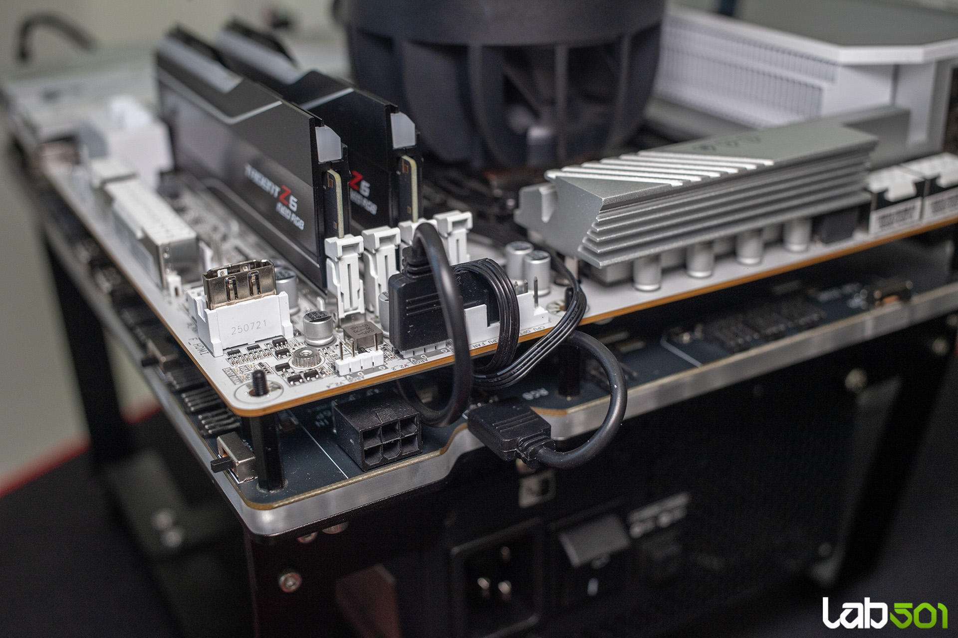 Benchtable-ul vine cu noua standoff-uri preconfigurate pentru formatul ATX, insa acestea pot fi repozitionate pentru Mini-ITX sau Micro-ATX. Inainte de montarea placii de baza este recomandata verificarea pozitiei acestora, deoarece un standoff montat gresit poate zgaria sau chiar deteriora PCB-ul. Dupa montarea placii de baza, putem conecta accesoriile incluse: alimentarea PCIe cu 6 pini, cablul USB 2.0, cablurile pentru Power si Reset, cablul PWM 4-pin pentru control extern al ventilatoarelor si, optional, cablul ARGB cu 3 pini.