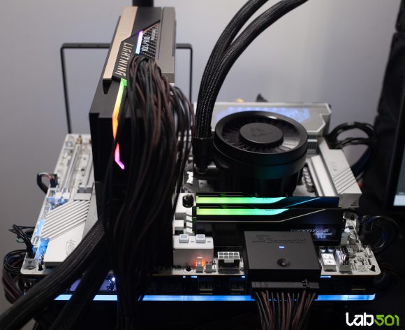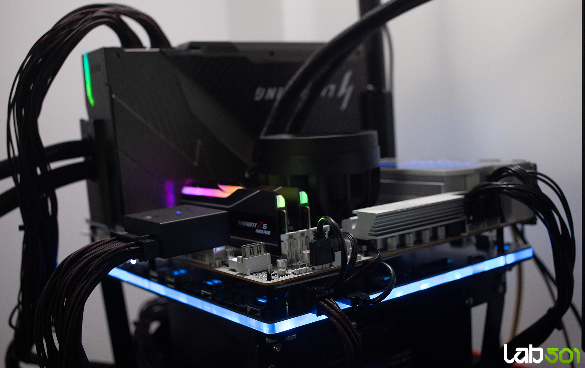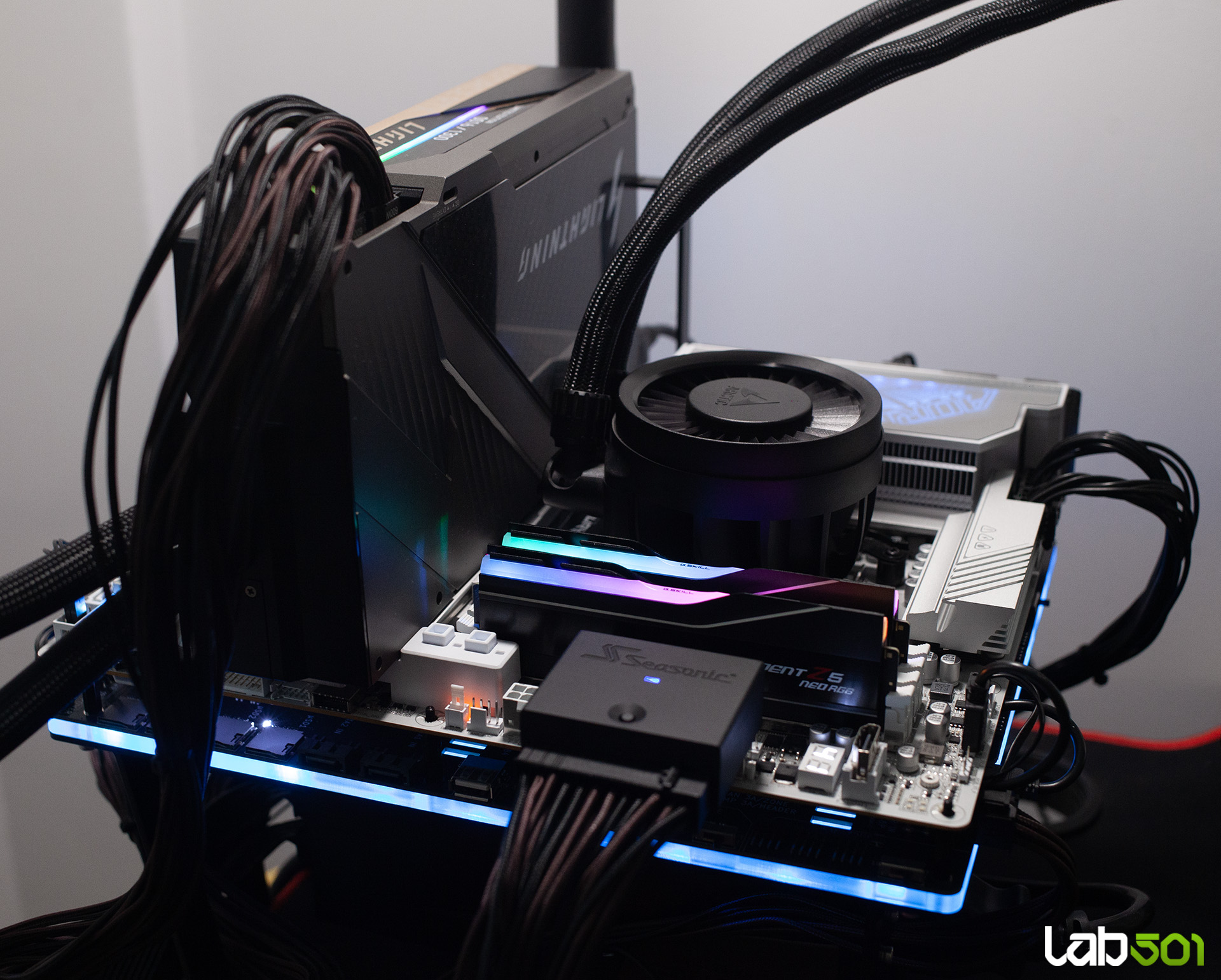 Benchtable-ul vine cu noua standoff-uri preconfigurate pentru formatul ATX, insa acestea pot fi repozitionate pentru Mini-ITX sau Micro-ATX. Inainte de montarea placii de baza este recomandata verificarea pozitiei acestora, deoarece un standoff montat gresit poate zgaria sau chiar deteriora PCB-ul. Dupa montarea placii de baza, putem conecta accesoriile incluse: alimentarea PCIe cu 6 pini, cablul USB 2.0, cablurile pentru Power si Reset, cablul PWM 4-pin pentru control extern al ventilatoarelor si, optional, cablul ARGB cu 3 pini.