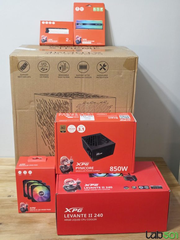 De asemenea, pe latura superioara putem monta un radiator de 240mm sau 360mm, ceea ce se potriveste perfect cu AIO-ul XPG Levante II 240 folosit de noi pentru racirea procesorului. Pentru a obtine un flux de aer optim in carcasa, am folosit de asemenea si doua ventilatoare XPG Vento R 120 ARGB PWM, montate pe latura inferioara.