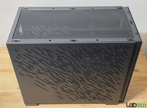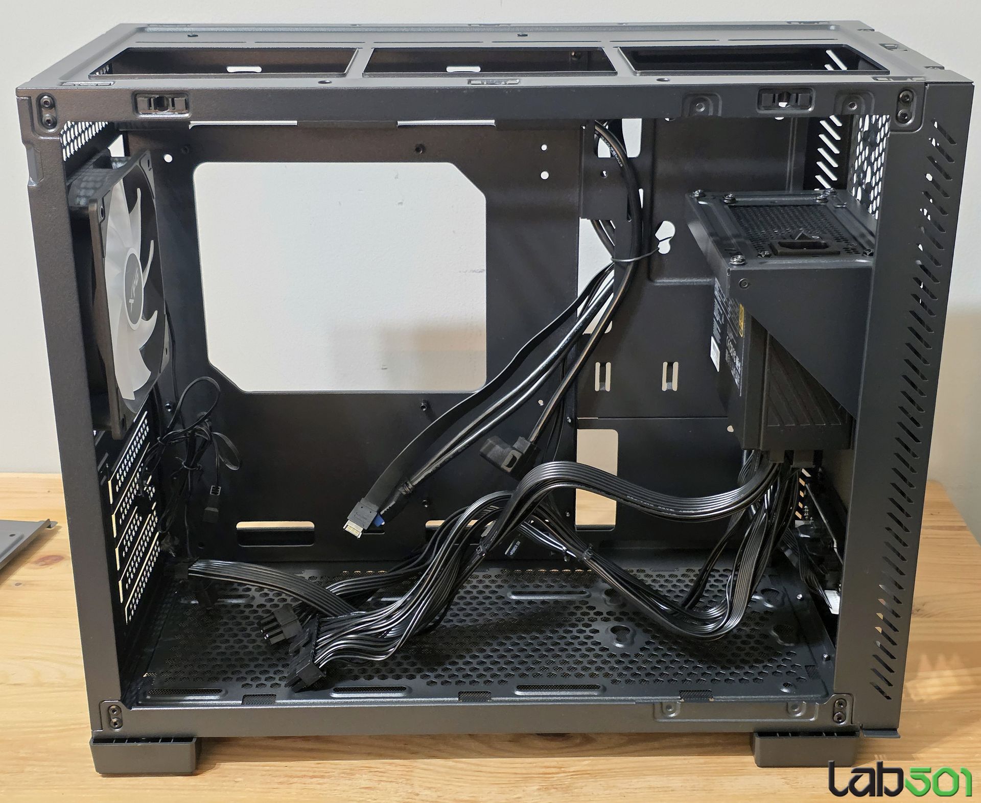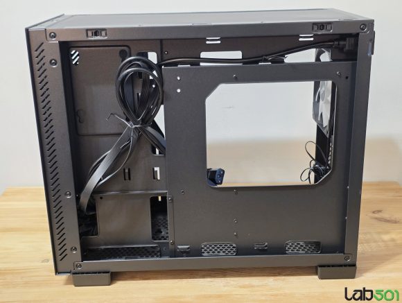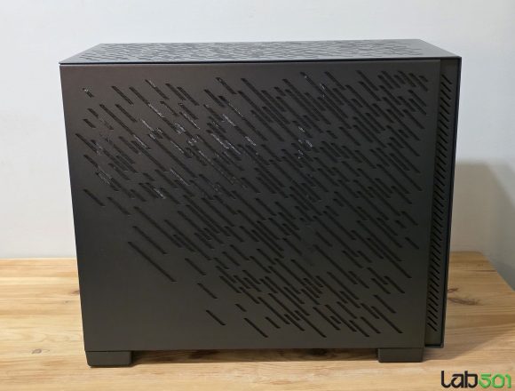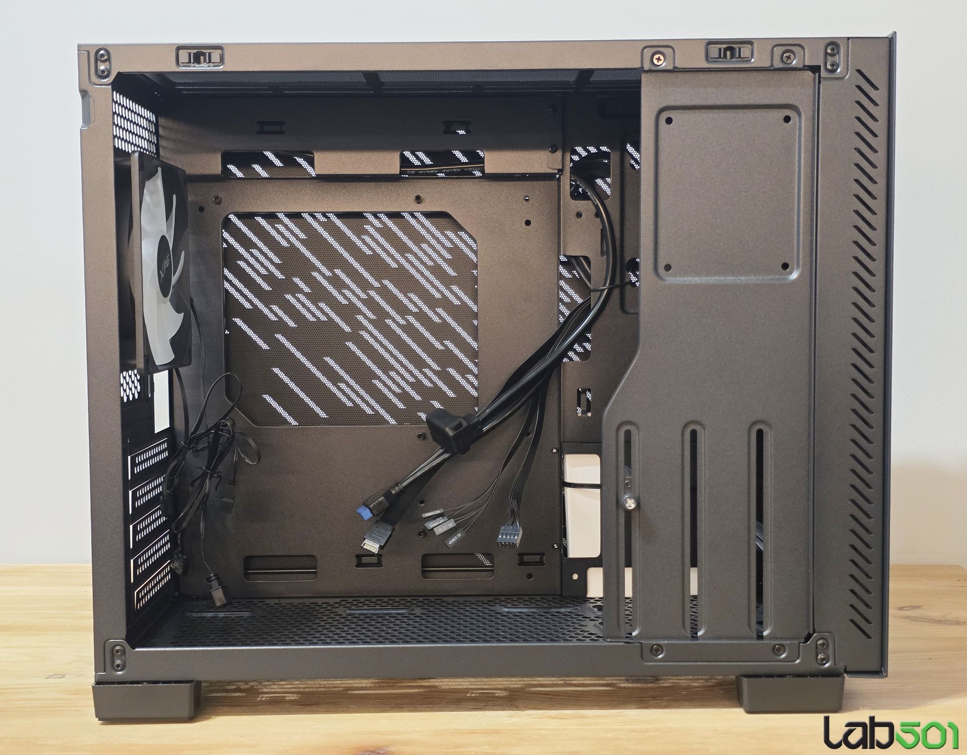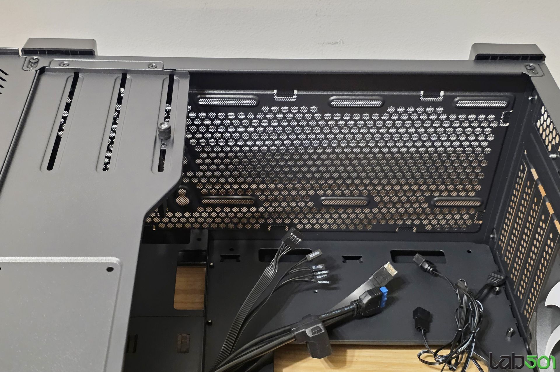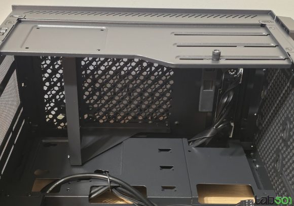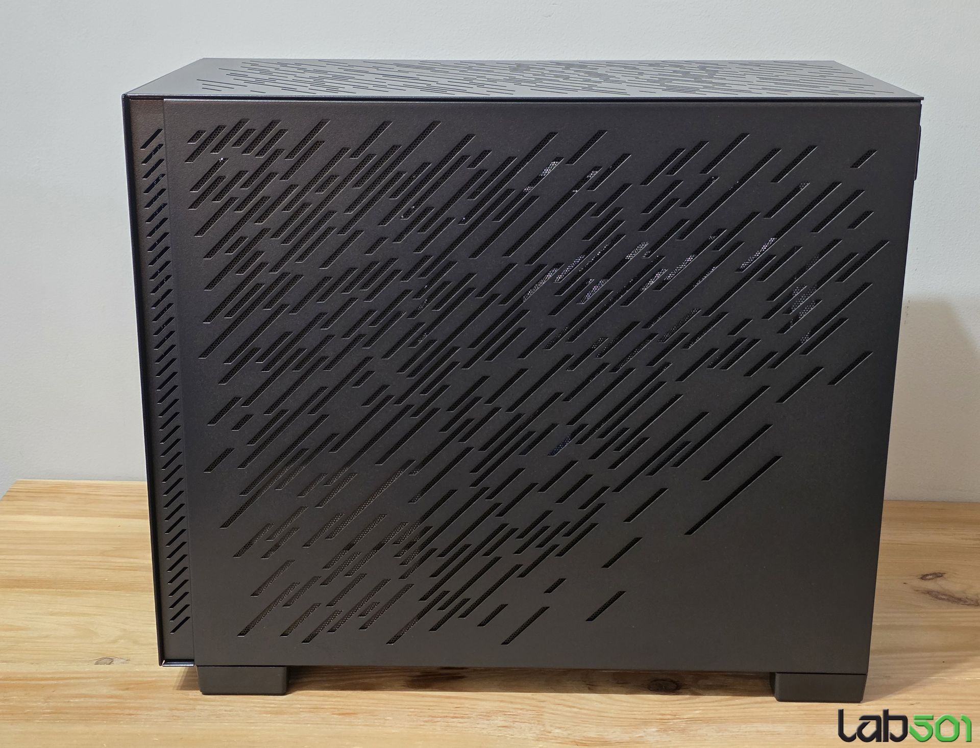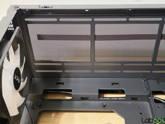 Carcasa nu este dotata cu suprafete transparente, fiind echipata cu 5 laturi acoperite cu tabla decupata, protejate de filtre de praf magnetice. Practic, accentul este pus pe obtinerea unui flux de aer cat mai ridicat. Pentru a ascunde partial cablurile sursei, dar si pentru a oferi sprijin pentru placa video, XPG Valor Air Nano este echipata cu un montant vertical demontabil, pozitionat inspre latura din fata a carcasei.