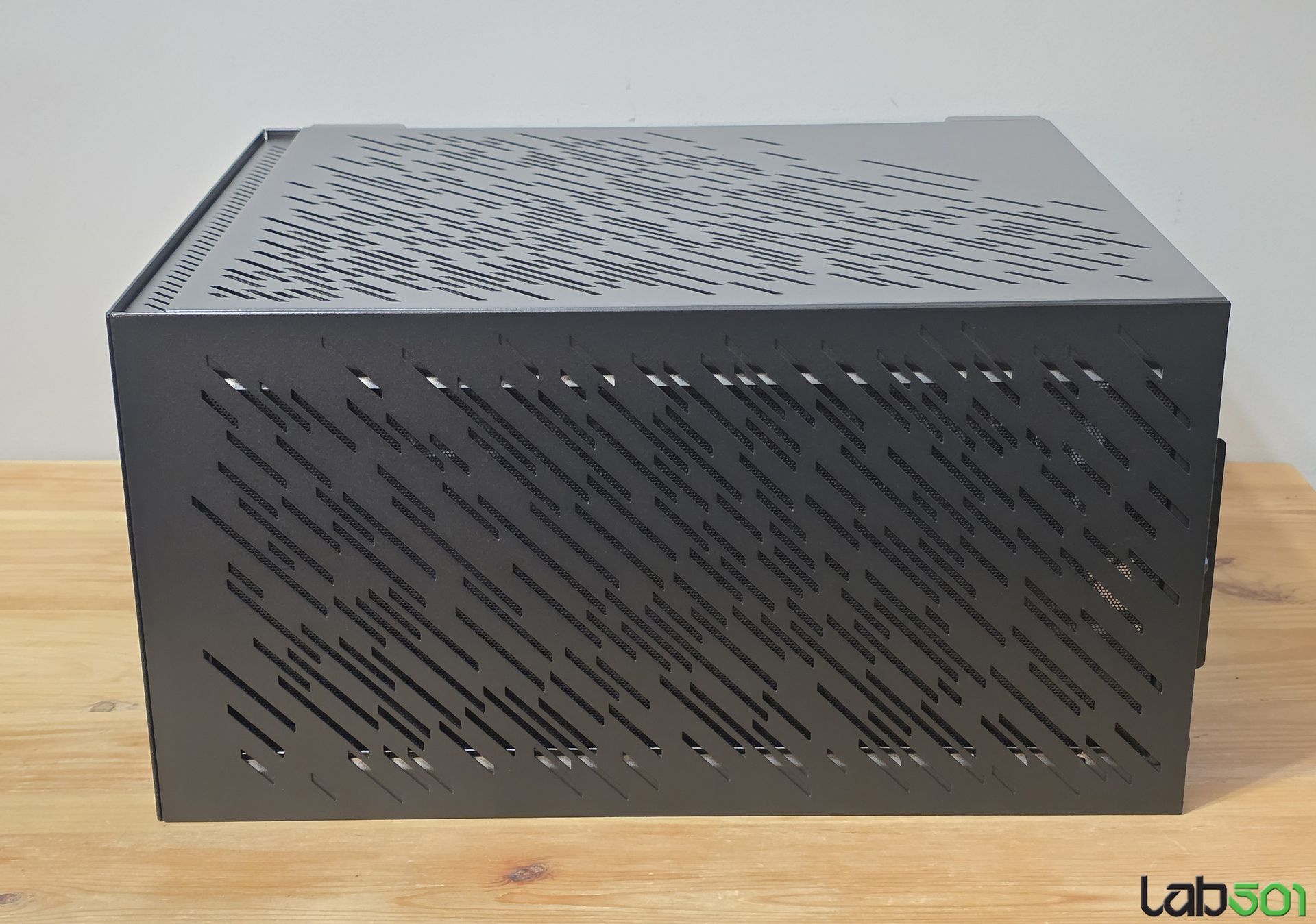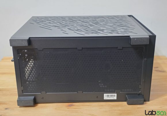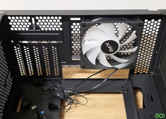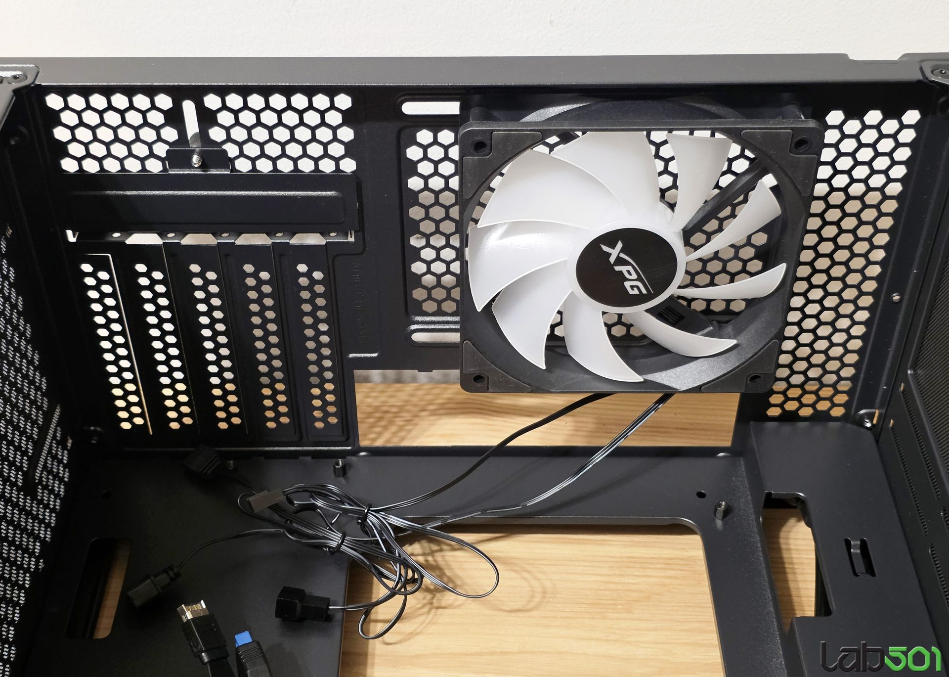 Portofoliul ADATA contine doua carcase certificate NVIDIA SFF-Ready, mai precis XPG Valor Mesh Nano si XPG Valor Air Nano. Noi am ales cel de-al doilea model, pentru raportul excelent intre dimensiuni scazute si potential de racire. Astfel, carcasa suporta pana la 3 ventilatoare de 120mm sau 2 ventilatoare de 140mm pe latura superioara, 2 ventilatoare de 120mm pe latura inferioara si un ventilator de 120mm (montat din fabrica) pe latura din spate.