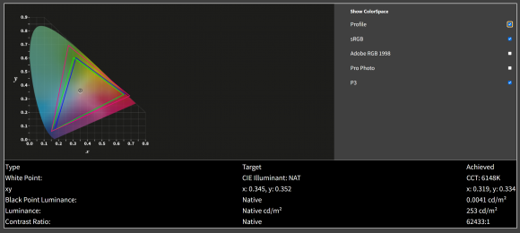 Nivelul de alb este cel specific acestui tip de panou, colorimetrul nostru masurand o valoare de 253 cd/m². Desigur, fiind vorba despre un monitor QD-OLED, nivelul maxim de alb poate atinge 1000 cd/m² pe zone restranse (3% din suprafata) sau 400 cd/m² pe 10% din suprafata. Contrastul este, evident, excelent, iar reproducerea culorilor este pur si simplu superba. De altfel, producatorul garanteaza un DeltaE mediu mai mic sau egal cu 2, insa in testele noastre am masurat o medie excelenta, de doar 0.7 si o valoare maxima de 1.4.
