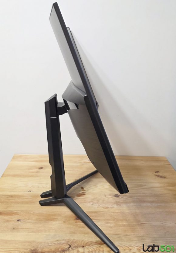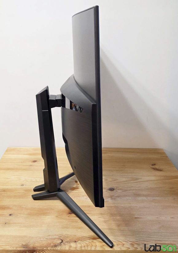 Monitorul este livrat intr-un ambalaj voluminos, in care gasim adaptorul la priza, un cablu Display Port, manualul utilizatorului si piciorul monitorului. Acesta ofera posibilitati reduse de ajustare, display-ul putand pivota in plan vertical cu valori cuprinse intre -5 si 20 grade, oferind de asemenea 130mm pentru reglarea inaltimii.