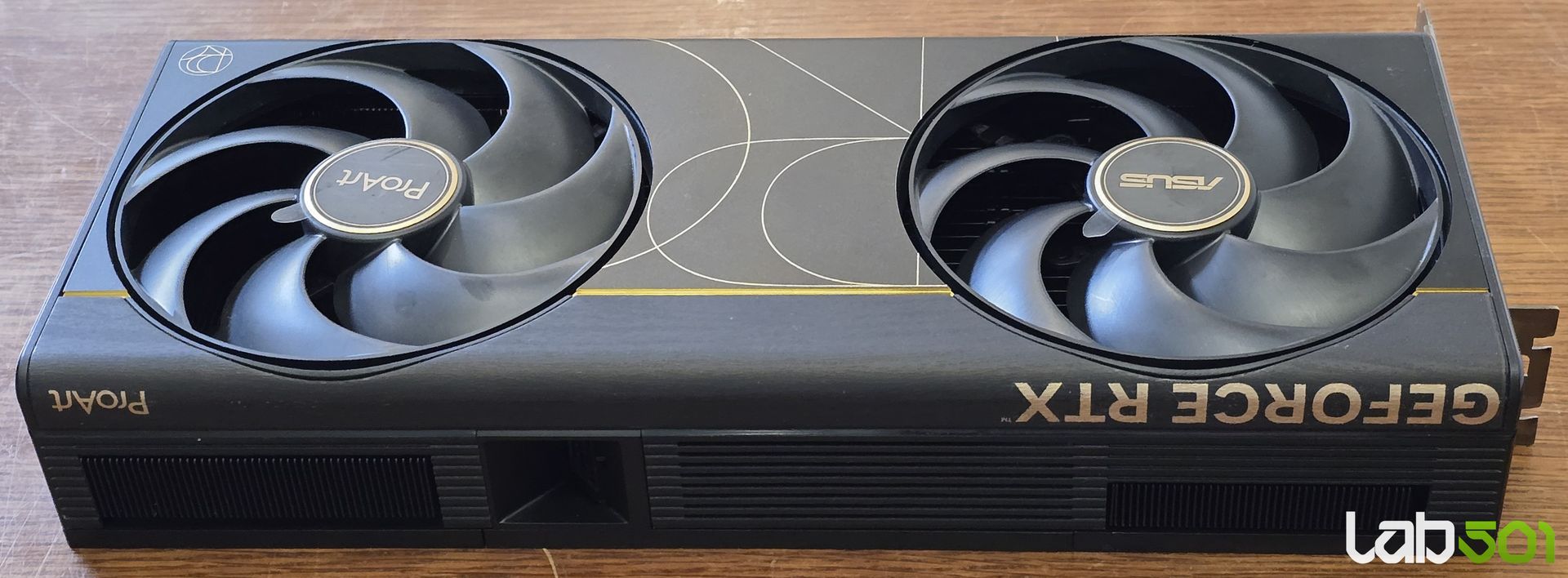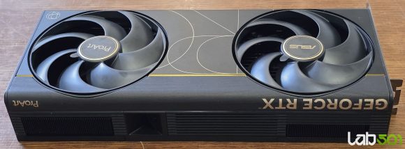 Sistemul de racire este echipat cu doua ventilatoare de 115mm in partea frontala, capabile sa asigure un debit de aer si o presiune statica superioare, in timp ce backplate-ul are doua decupaje de dimensiuni generoase pentru evacuarea eficienta a aerului cald. ASUS foloseste pasta termica pe baza de metal lichid intre GPU si sistemul de racire, acesta din urma fiind echipat cu vapor chamber – doua elemente care contribuie direct la temperaturi scazute si la mentinerea unor frecvente boost ridicate in sarcina sustinuta.