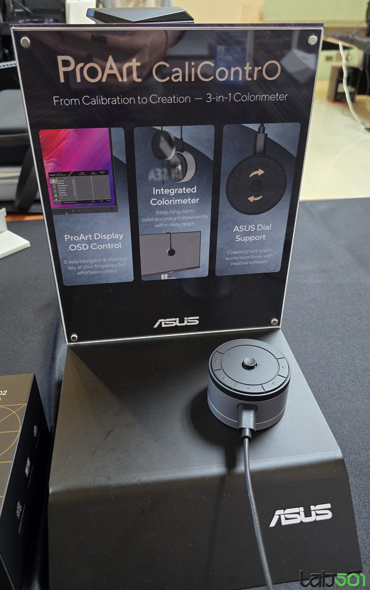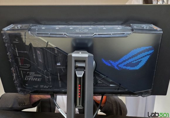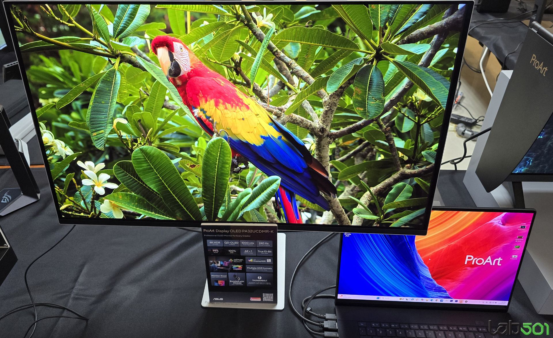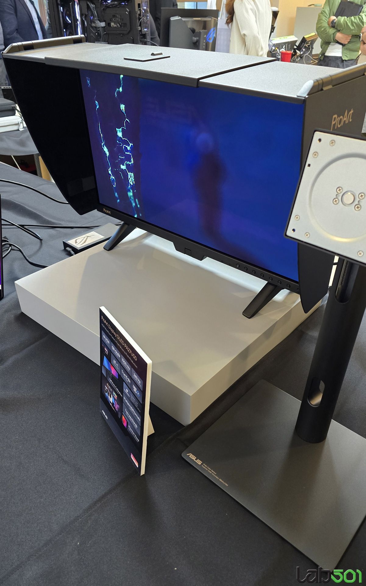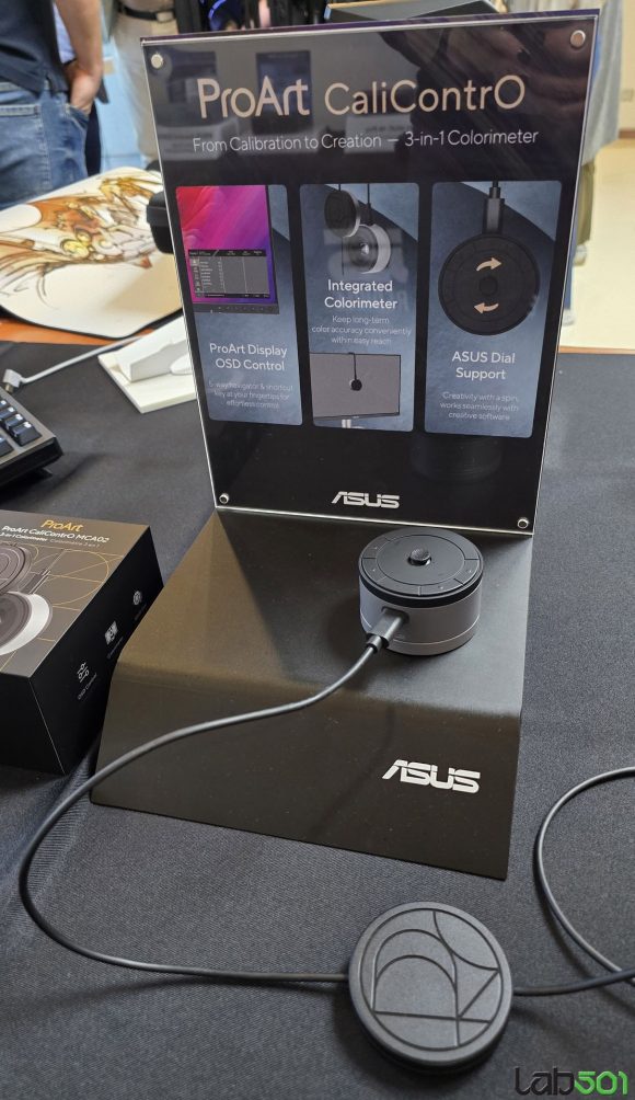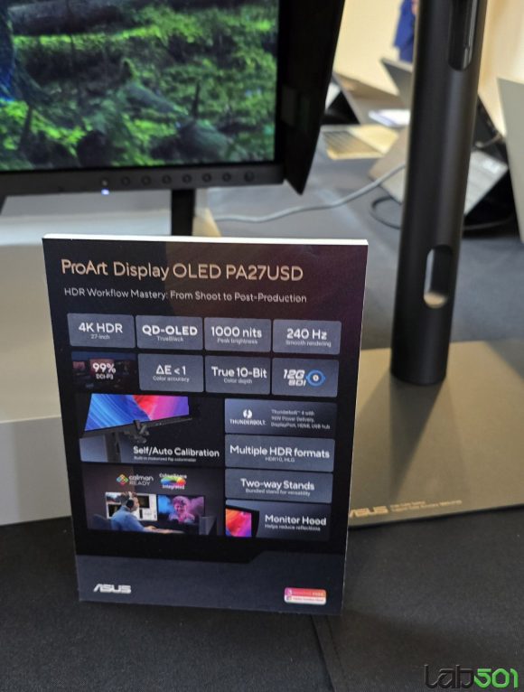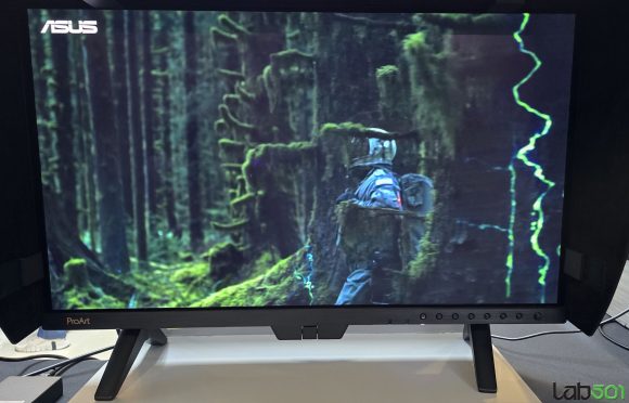Am vazut de asemenea si doua monitoare noi din gama ProArt, mai precis ASUS ProArt Display OLED PA27USD, echipat cu un panou OLED 4K cu o diagonala de 26.5″, care ofera reproducere 99% a spatiului de culoare DCI-P3 si o reproducere a culorilor precisa (△E sub 1). Monitorul este dotat cu conectivitate 12G-SDI (Serial Digital Interface), avand astfel posibilitatea de a reda material 4K necomprimat la 60Hz, in formatele HDR-10, HLG si Dolby Vision. O functie interesanta este colorimetrul incorporat, care permite auto-calibrarea rapida, precum si echiparea cu picioare scurte si parasolare care elimina relefxiile, pentru a respecta rigorile intalnite pe platourile de filmare.