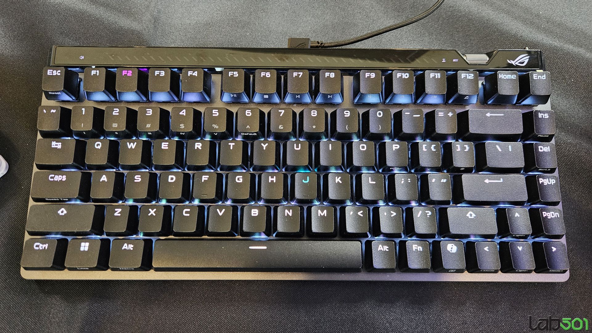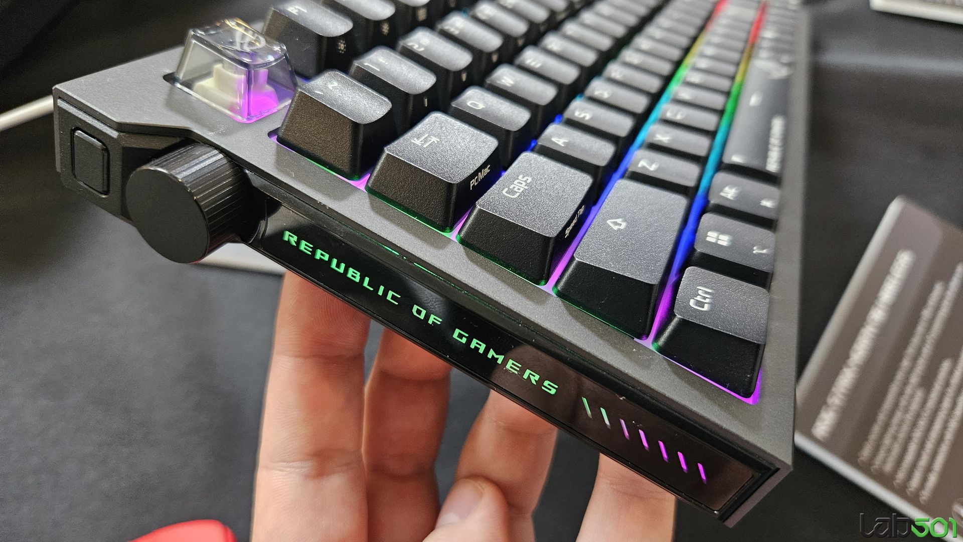 Tastatura este livrata din fabrica impreuna cu switch-uri mecanice ROG NX V2, trei keycaps-uri ASUS ROG, precum si doua benzi iluminate incastrate pe cele doua laterale.