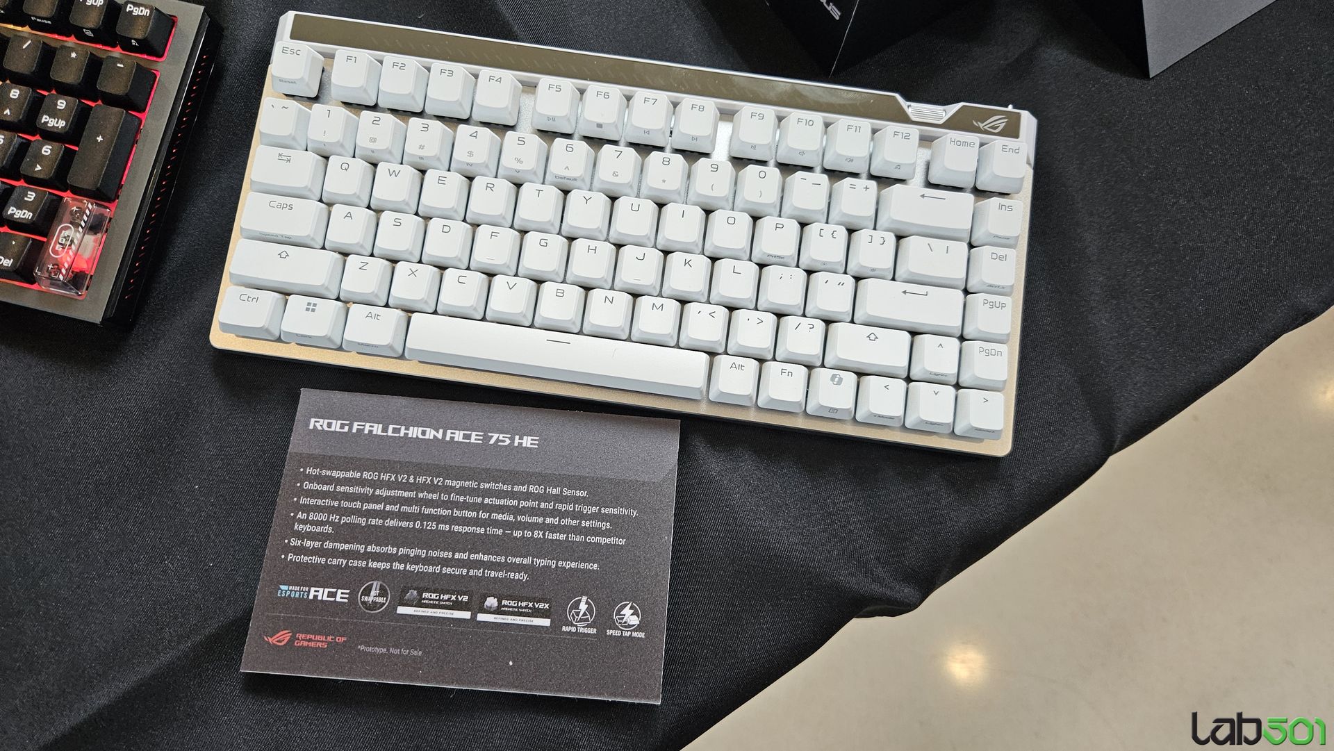 ASUS ROG Falchion Ace 75 HE este o tastatura compacta, echipata cu switch-uri magnetice hot-swappable ROG HFX V2, acestea oferind posibilitatea de a personaliza distanta de actuare intre 0.1–3.5mm, in pasi de 0.01mm. Tastatura ofera un polling rate de 8000 Hz si este livrata din fabrica impreuna cu keycaps-uri ROG Doubleshot PBT.
