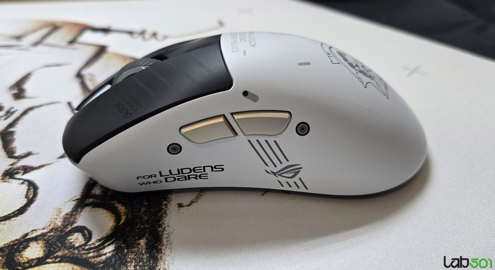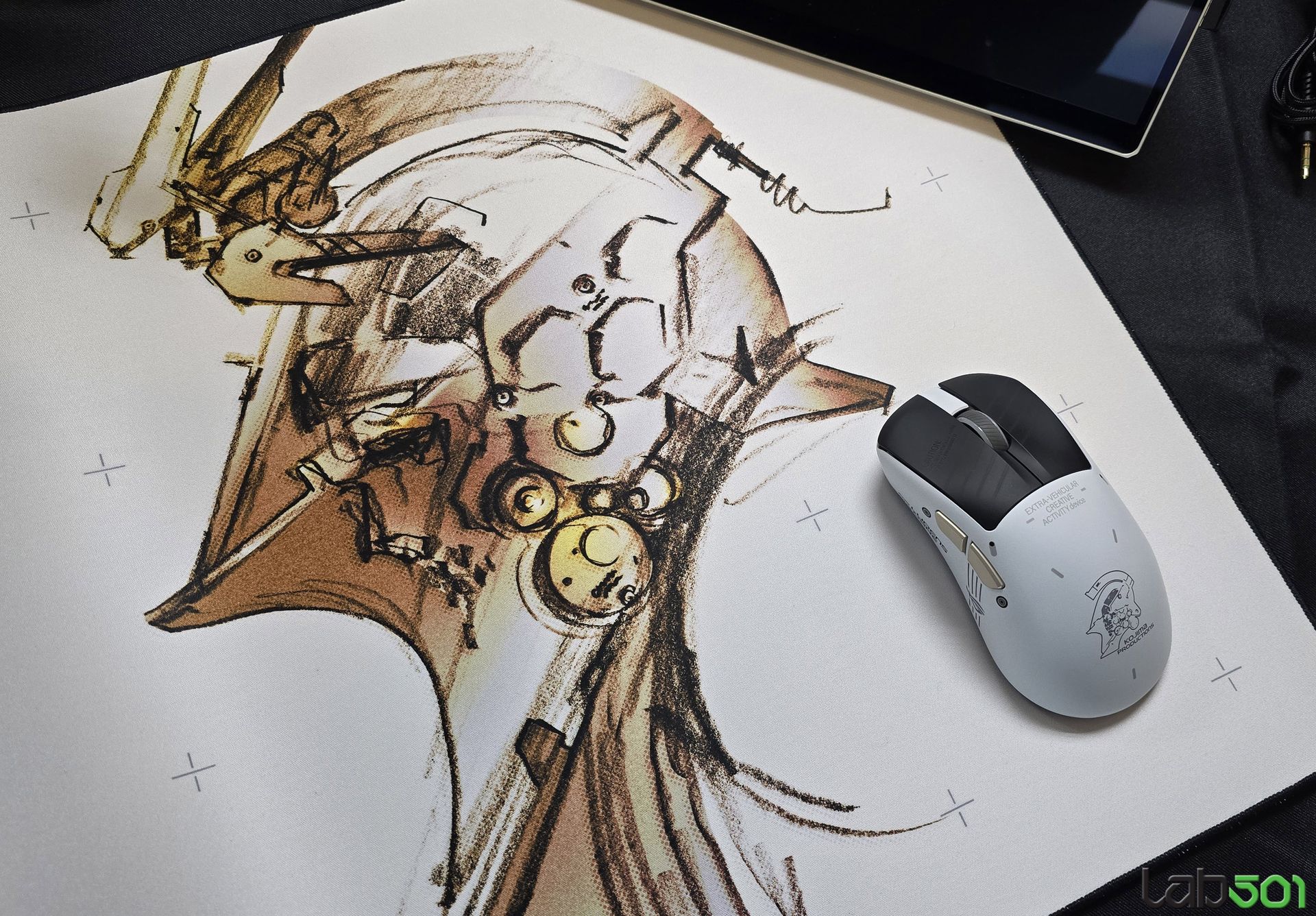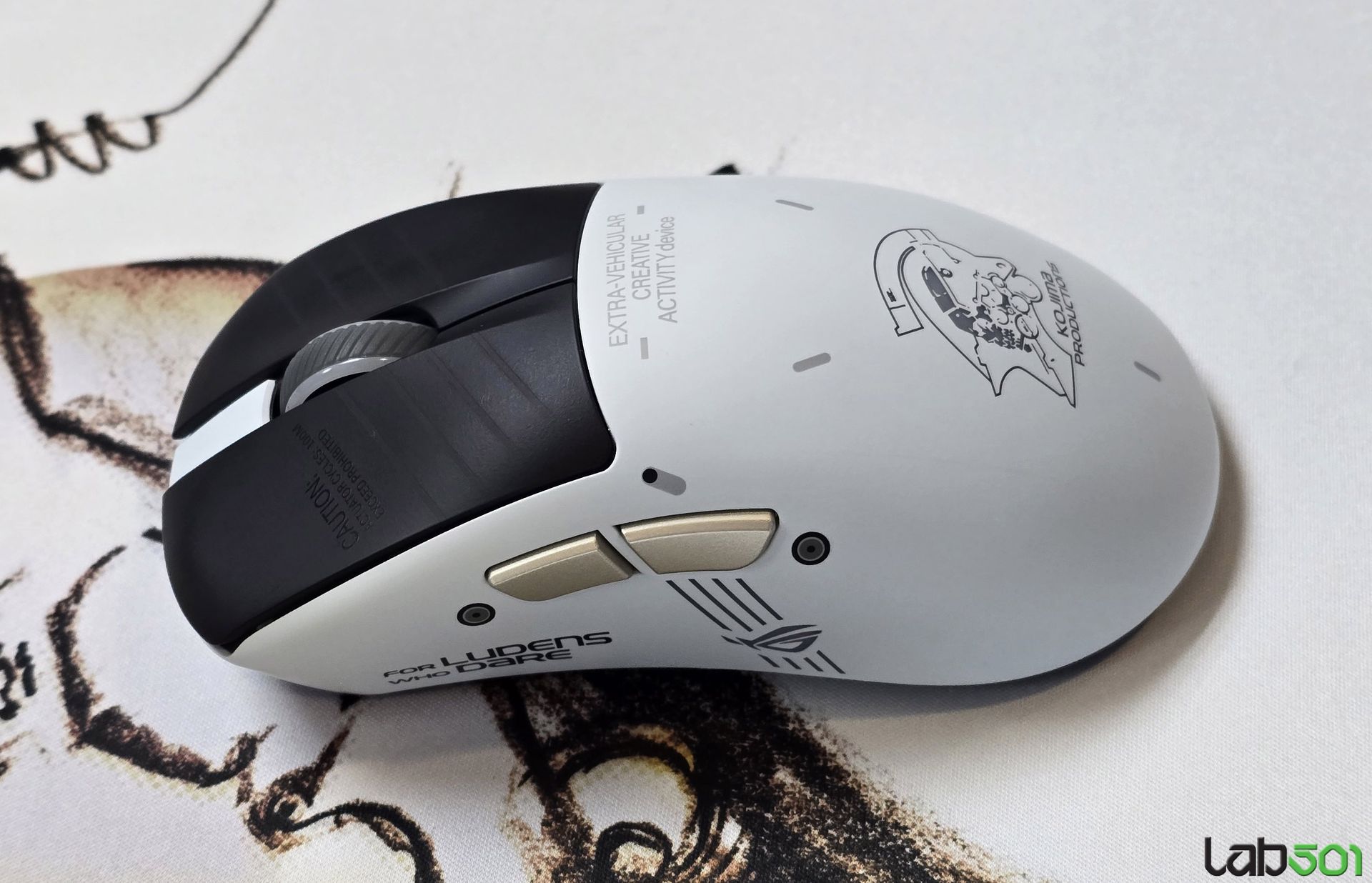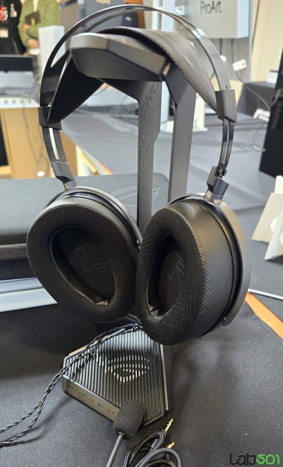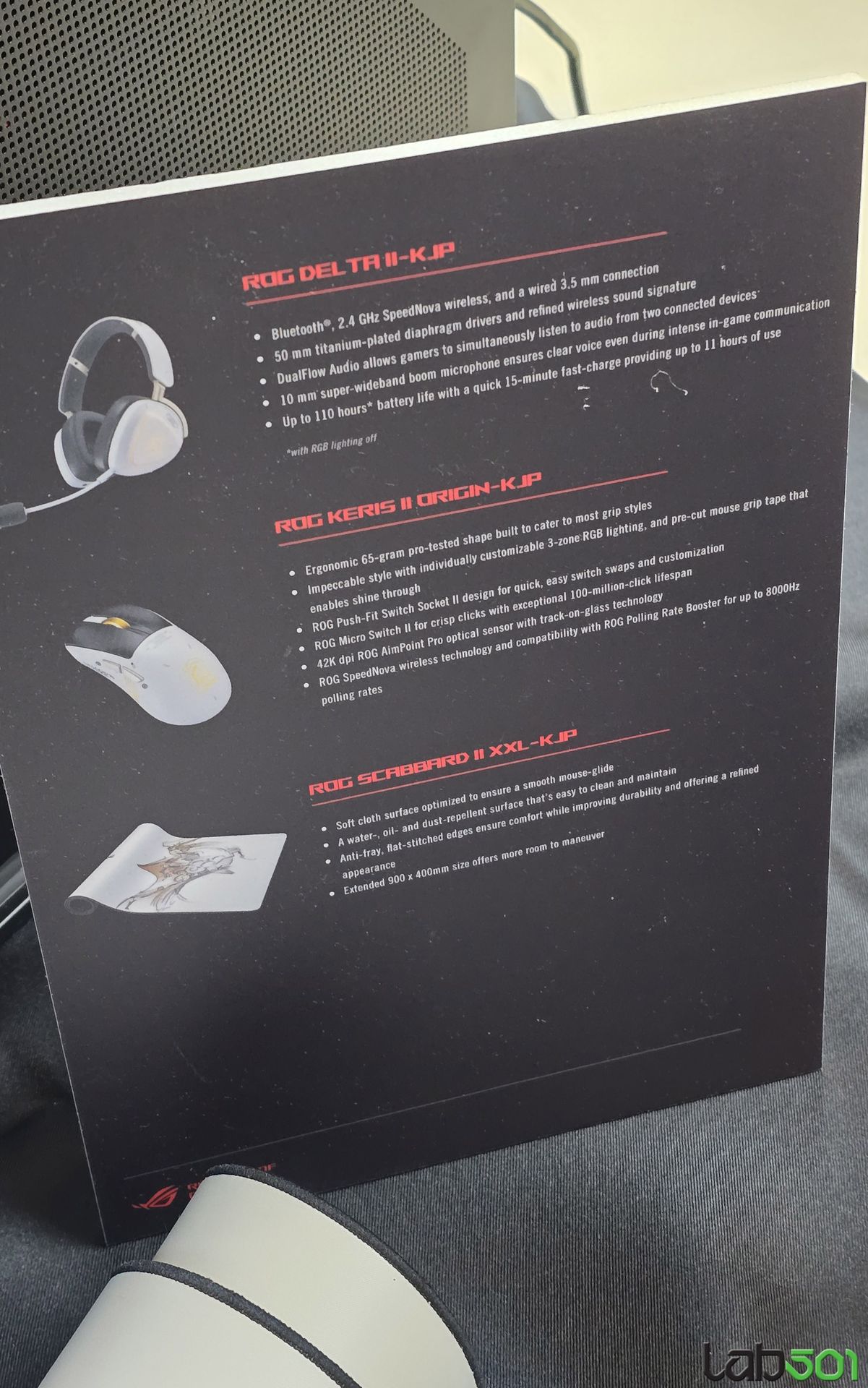 Nu in ultimul rand, am vazut si seria de periferice dezvoltate in colaborare cu Kojima Productions, mai precis mouse-ul ASUS ROG Keris II Origin-KJP ( senzor optic 42000dpi, functie track-on-glass), mousepad-ul ASUS ROG Scabbard II XXL-KJP, rezistent la apa, ulei si praf, precum si headset-ul ASUS ROG Delta II-KJP, echipat cu driveri titanium-plated de 50mm si microfon super-wideband cu capsula de 10mm.